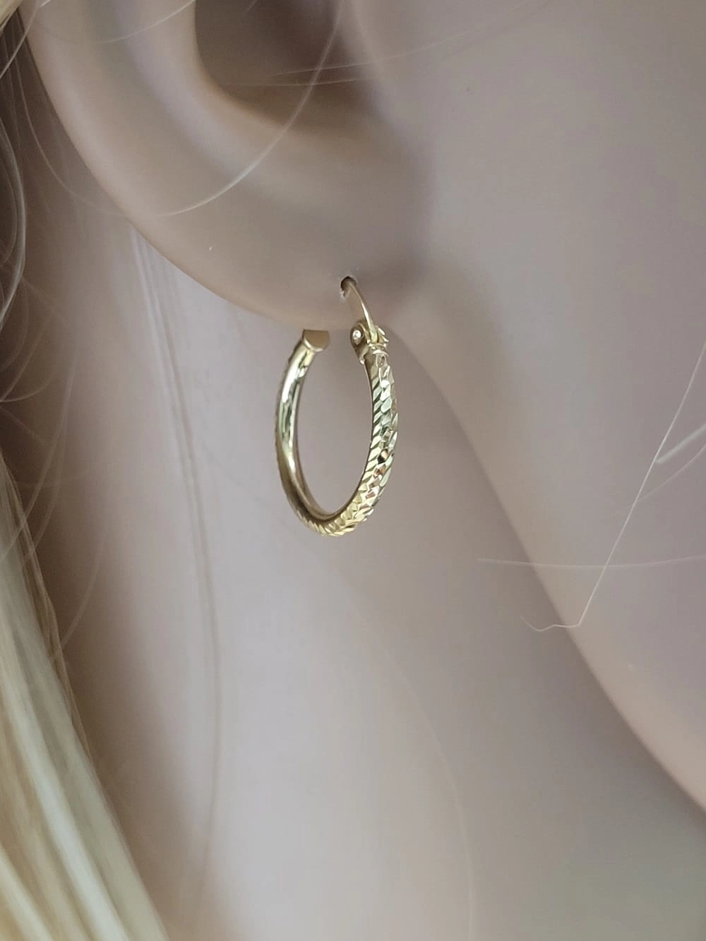 Šie auskarai sukurti su ypatingu dėmesiu detalėms ir preciziškumu, siekiant užtikrinti ne tik estetinį grožį, bet ir išskirtinį patogumą. Jų subtilus, bet ryškus dizainas su išraižytais raštais vienoje pusėje ir lygia, poliruota briauna kitoje, leidžia juos nešioti įvairiomis progomis – nuo kasdienio įvaizdžio iki iškilmingų renginių. Auskarų skersmuo yra 1,7 cm, o plotis – 2,0 mm, todėl jie yra pakankamai pastebimi, bet ne per daug įpareigojantys. Tai puiki dovana sau ar brangiam žmogui, norint išreikšti meilę, pagarbą ar tiesiog nustebinti.