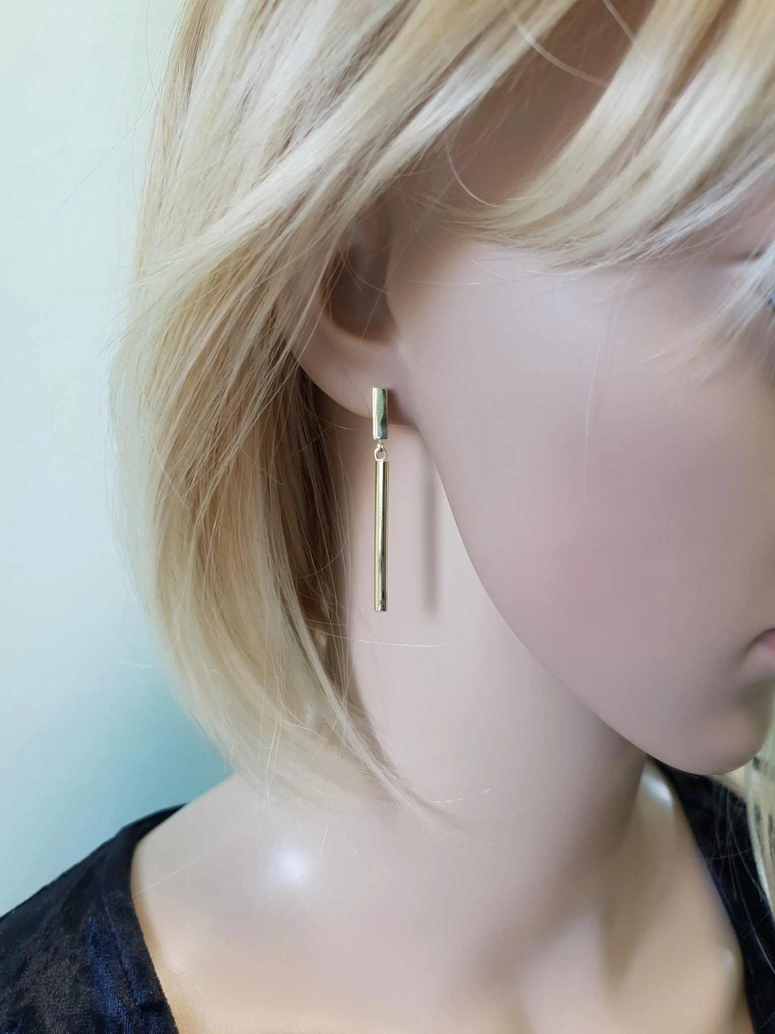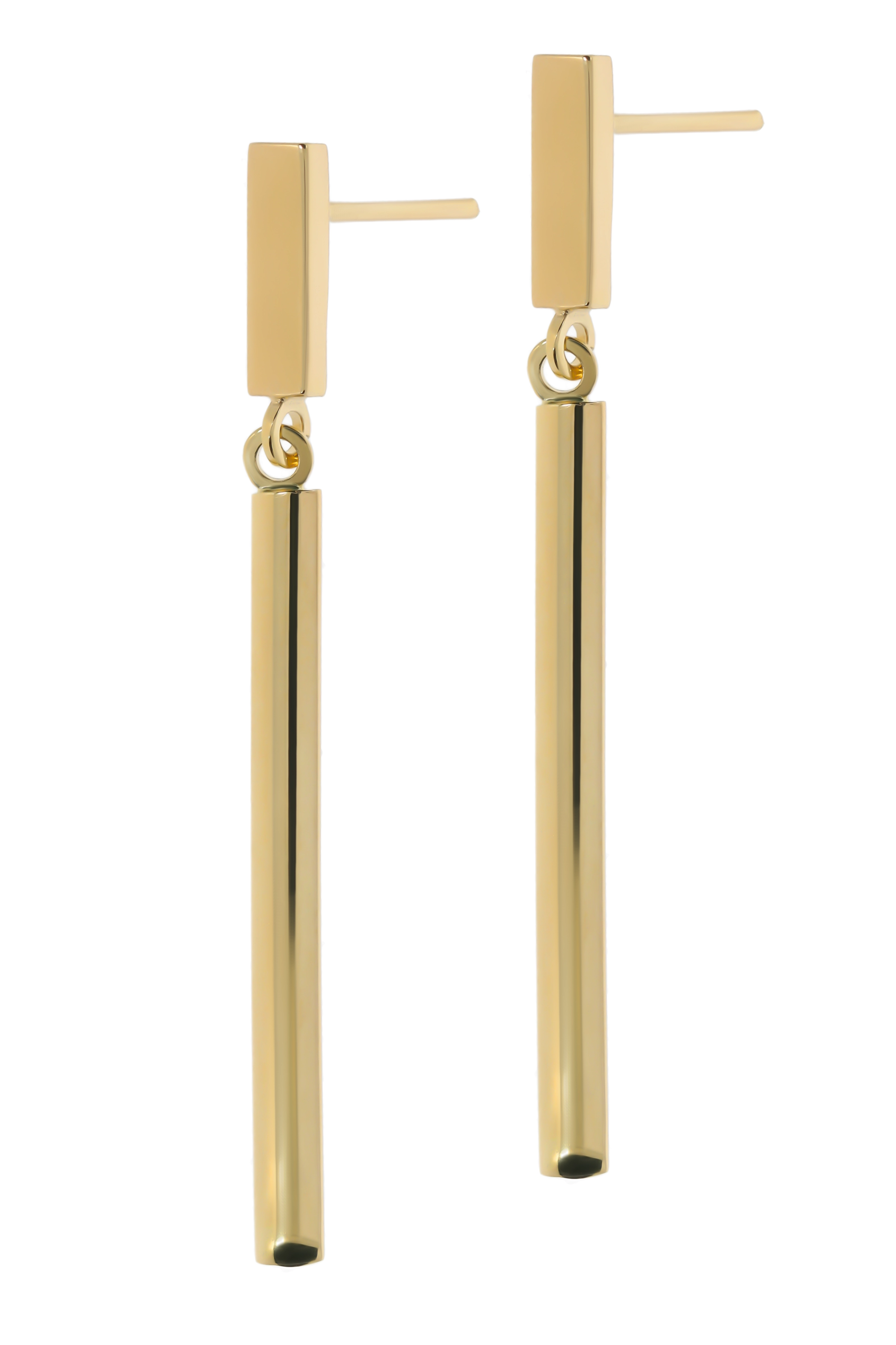 Kruopščiai pagaminti iš aukščiausios kokybės 585 prabos geltono aukso, šie kabantys auskarai išsiskiria savo moderniu ir minimalistiniu dizainu. Kiekvienas auskaras yra sudarytas iš subtilios stačiakampio formos viršutinės dalies, nuo kurios grakščiai nusileidžia ilgas, poliruotas cilindras. Ši forma sukuria vizualiai patrauklų siluetą, kuris švelniai supasi su kiekvienu Jūsų judesiu, suteikdamas žavesio ir elegancijos. Auskarų ilgis yra 4,60 cm, o plotis – 3 mm, todėl jie yra pakankamai pastebimi, tačiau ne per daug masyvūs, puikiai tinkantys tiek kasdieniam nešiojimui, tiek ypatingoms progoms.