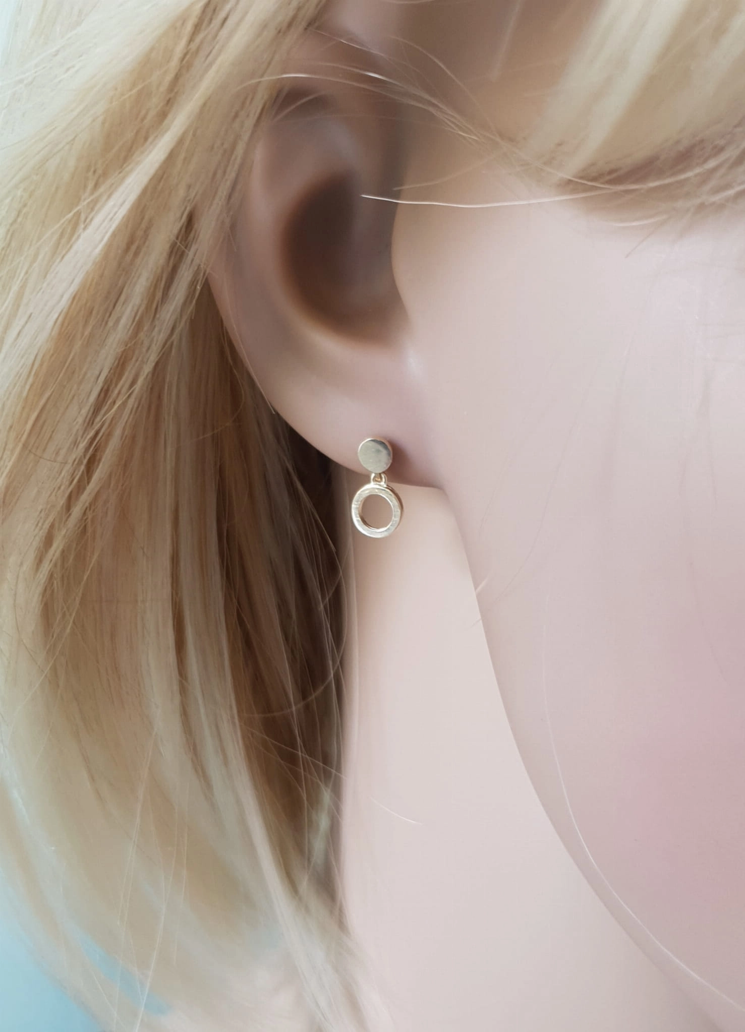 Kiekvienas auskaras susideda iš dviejų tobulų apskritimų: viršutinio, prigludusio prie ausies, ir apatinio, tuščiavidurio, elegantiškai kabančio ir suteikiančio lengvumo bei žaismingumo. Jų minimalistinis, bet kartu ir išraiškingas dizainas puikiai tiks tiek kasdieniam įvaizdžiui, tiek ypatingoms progoms, suteikdamas Jums pasitikėjimo savimi ir spindesio. Auskarų ilgis yra 1,2 cm, o plotis – 6,5 mm, idealiai tinkantis pabrėžti Jūsų veido bruožus.