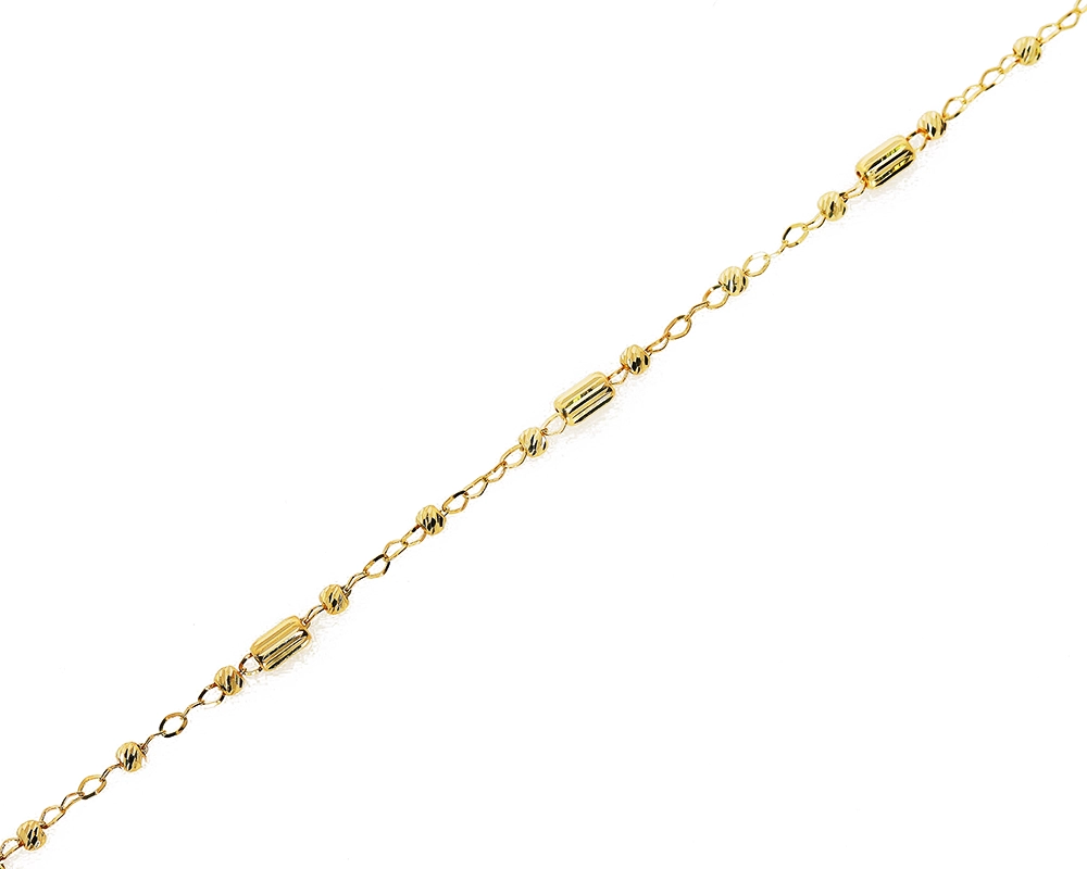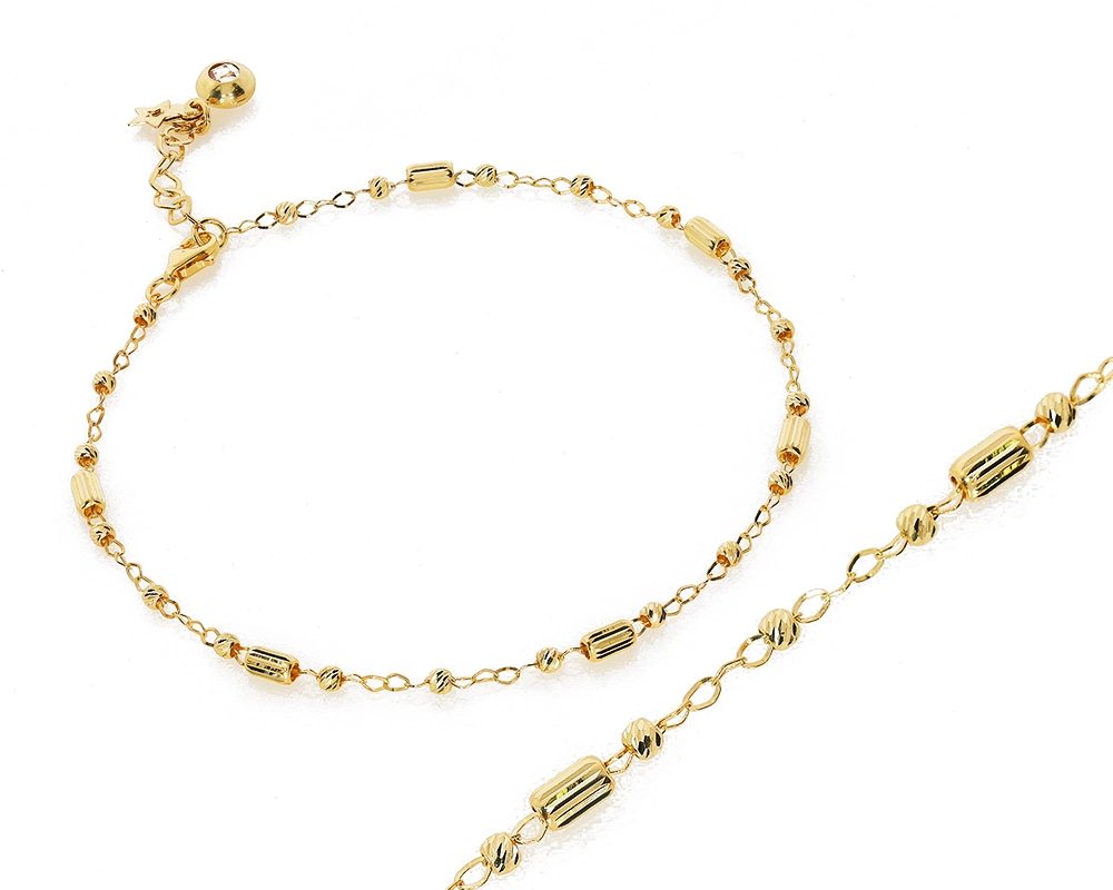 Pajuskite vasaros vėją su šia išskirtine moteriška geltono aukso apyranke ant kojos, kuri suteiks Jūsų įvaizdžiui nepakartojamo žavesio ir elegancijos. Tai ne tik papuošalas, bet ir subtilus akcentas, pabrėžiantis Jūsų stilių ir moteriškumą. Apyrankė sukurta iš aukščiausios kokybės 585 prabos geltono aukso, garantuojančio ilgaamžiškumą ir atsparumą. Jos unikalus dizainas, derinantis smulkias grandinėles su blizgančiais rutuliukais ir cilindro formos elementais, sukuria žaismingą ir modernų įspūdį. Prie užsegimo esantis žėrintis cirkonis suteikia papuošalui dar daugiau spindesio ir prabangos.