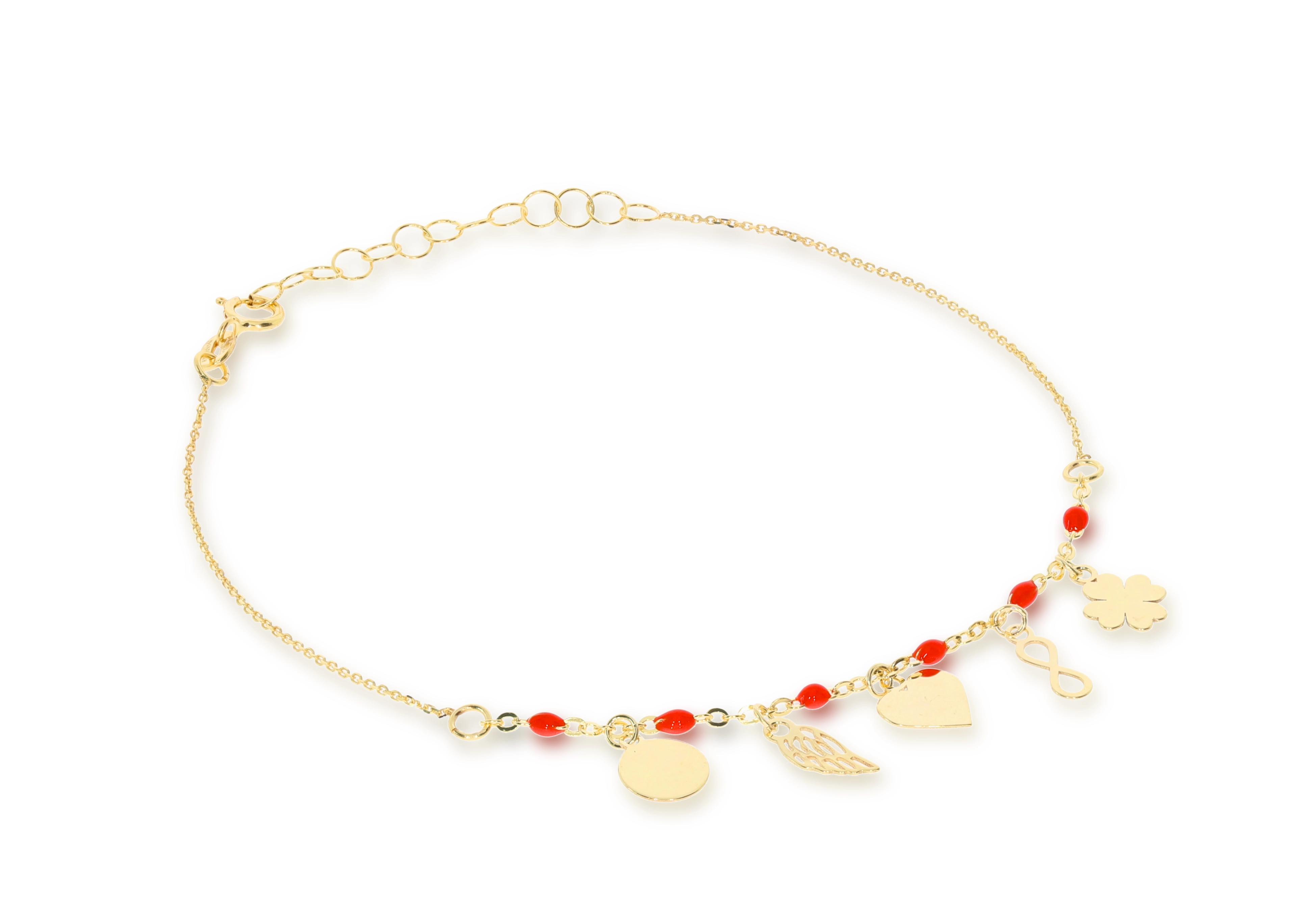 Apyrankę puošia žavūs pakabukai: širdelė, angelo sparnas, keturlapis dobilas, begalybės simbolis ir apvalus diskas, kurie suteikia jai individualumo ir simbolinės prasmės. Tarp pakabukų įkomponuoti ryškiai raudoni karoliukai suteikia apyrankei gyvybingumo ir spalvų žaismo, patraukiančio akį. Apyrankės elementų plotis yra 6 mm, o grandinėlės plotis – 1 mm, todėl ji atrodo subtiliai ir elegantiškai ant riešo. Ši apyrankė puikiai tinka tiek kasdieniam nešiojimui, tiek ypatingoms progoms, pridedant Jūsų įvaizdžiui rafinuotumo ir žavesio.