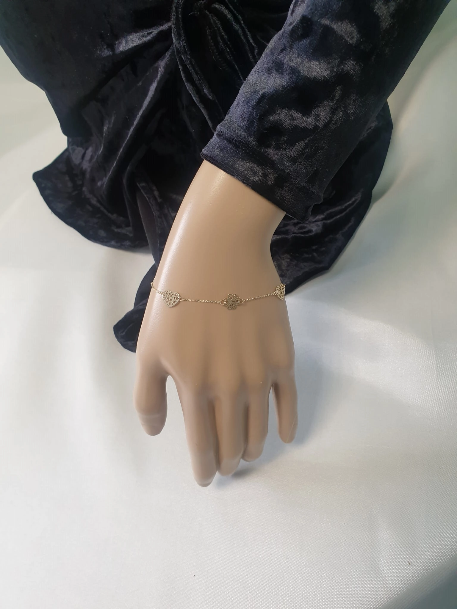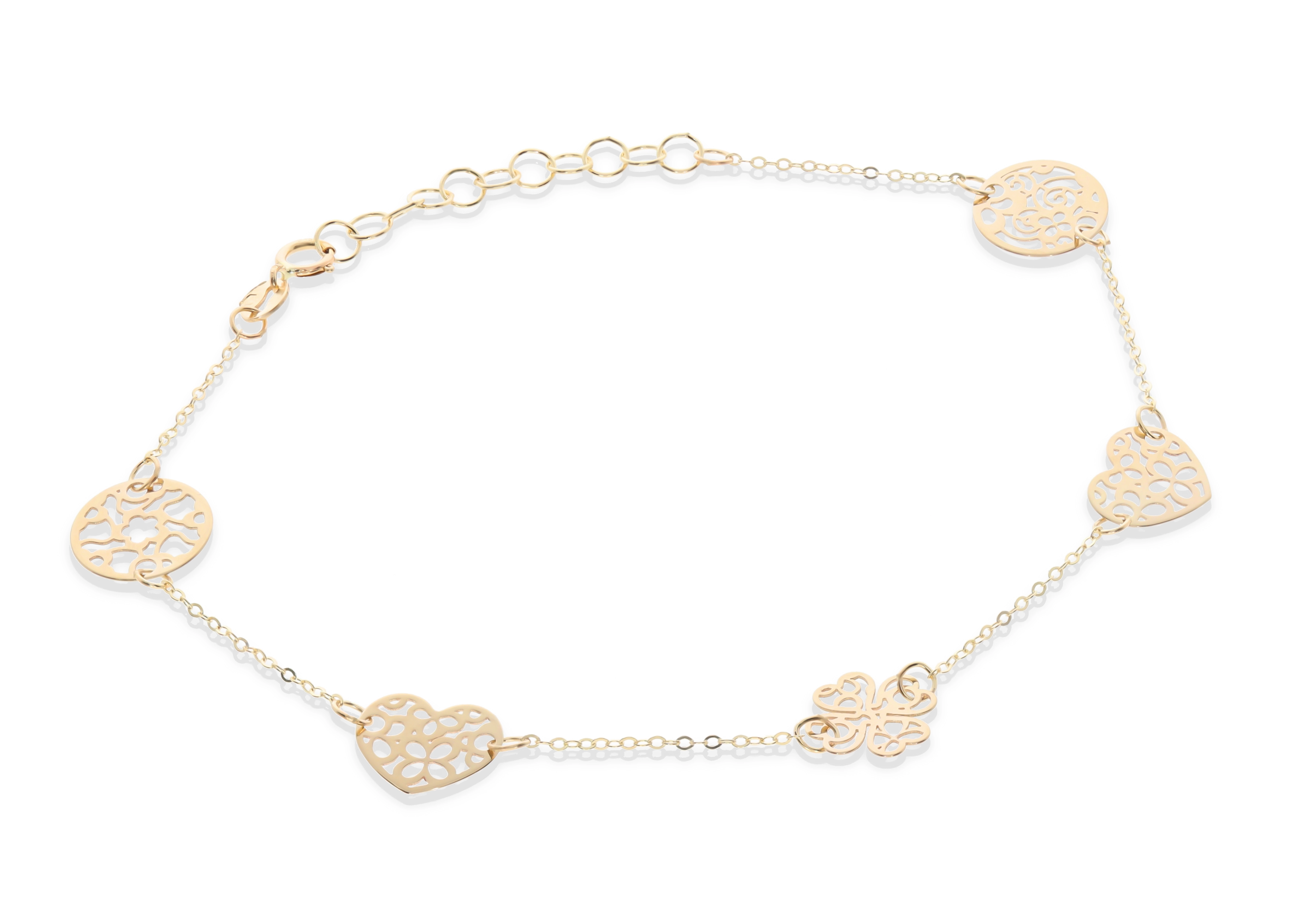 Moteriška geltono aukso apyrankė su širdelėmis ir dobilo lapeliu 585
