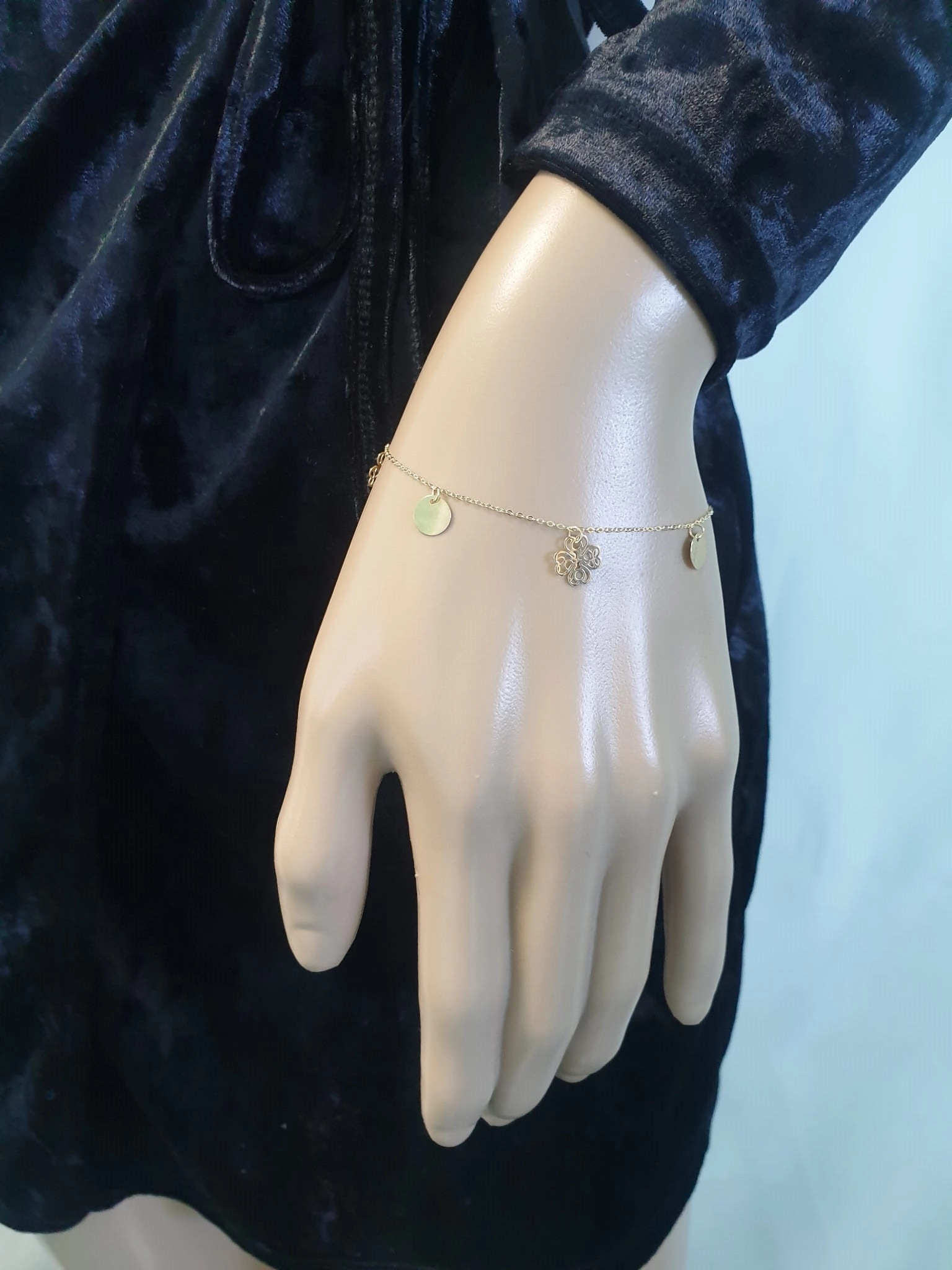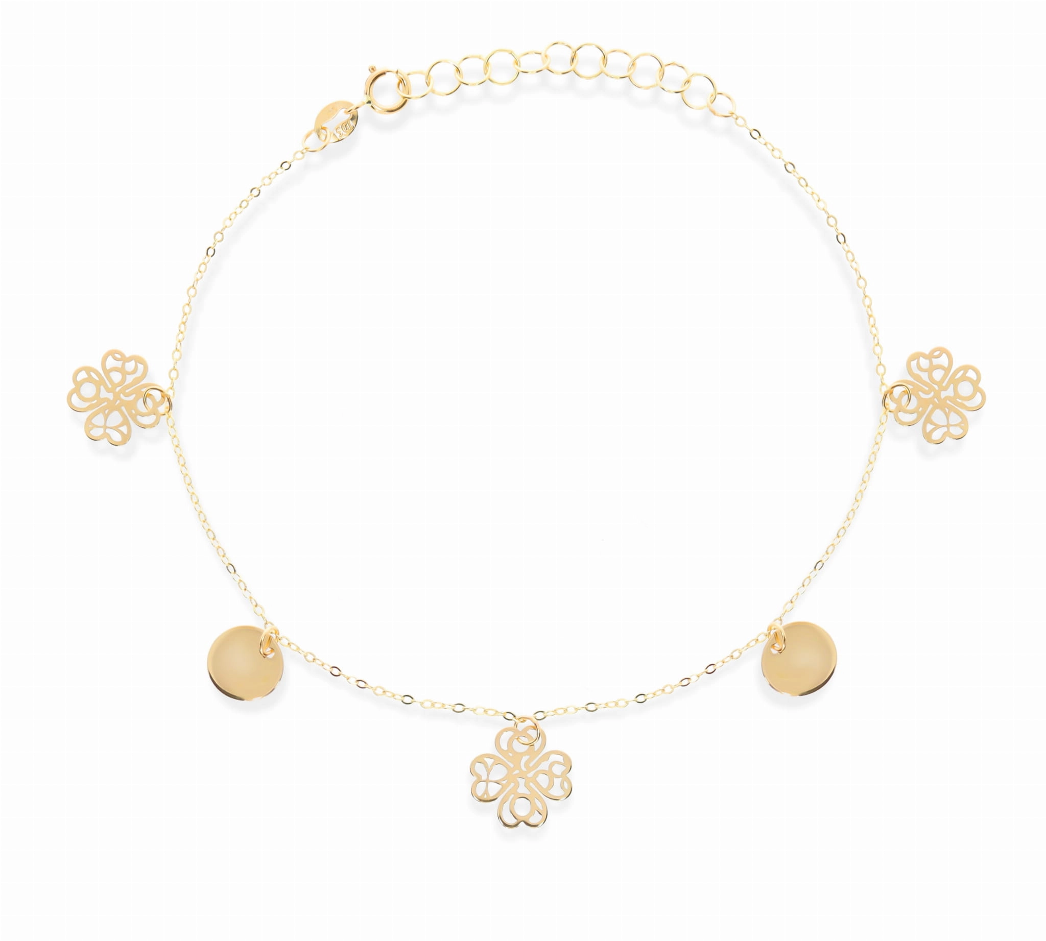 Moteriška geltono aukso apyrankė vėrinys su dobilėliais ir diskais 585