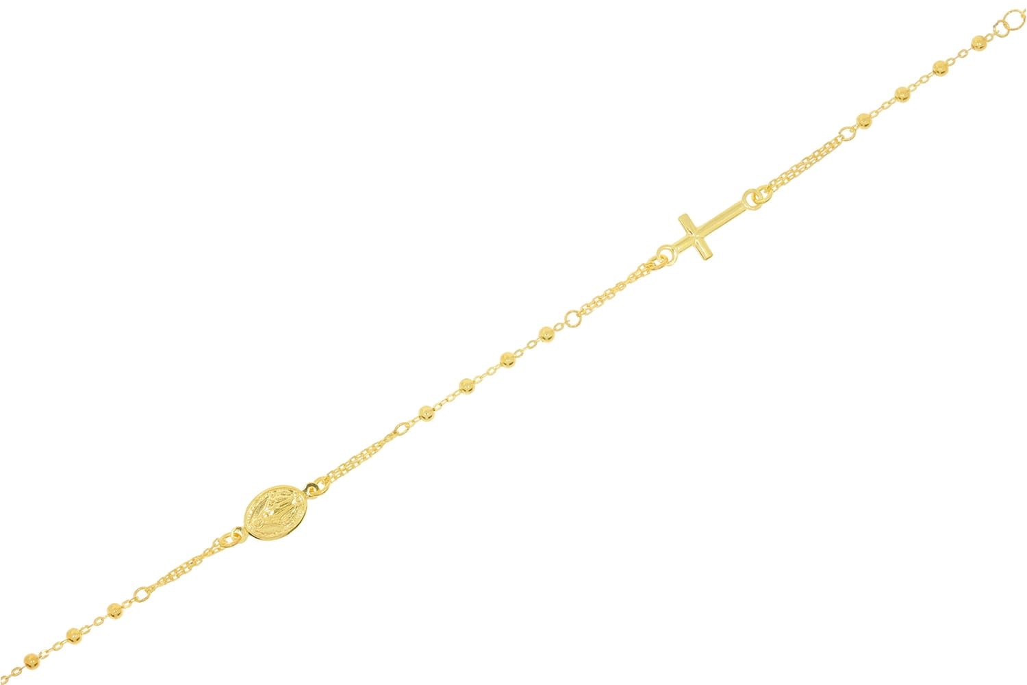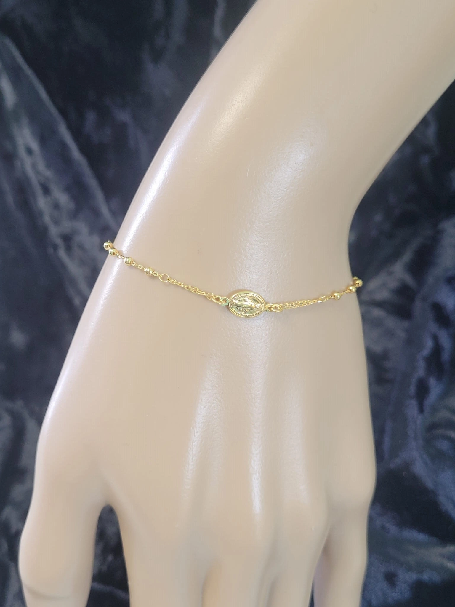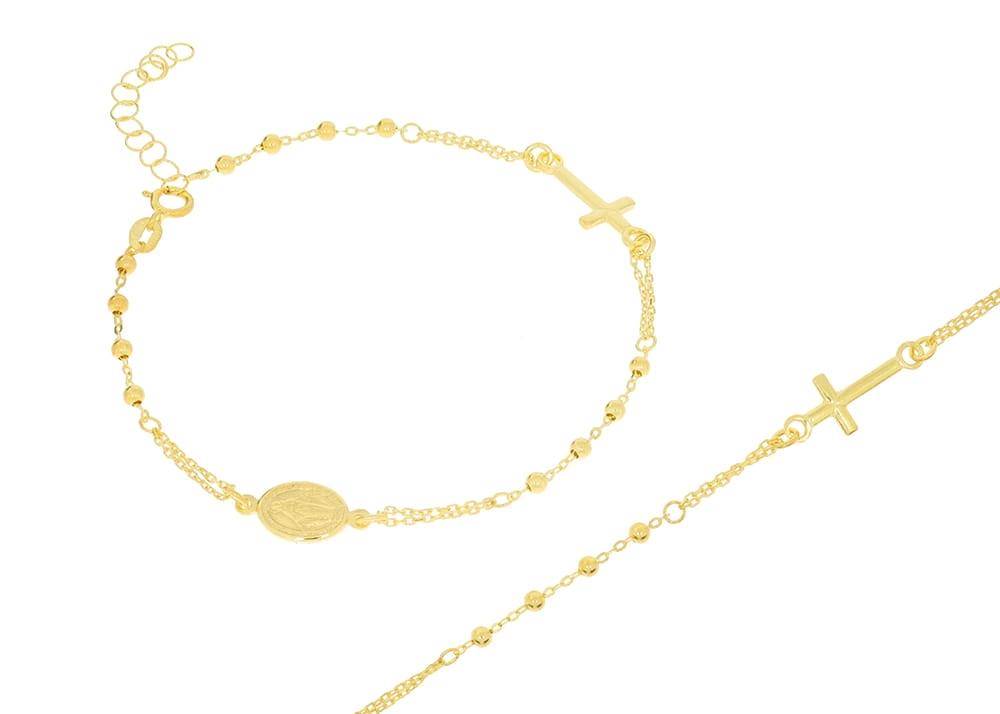 Apyrankės dizainas įkvėptas klasikinio rožinio, tačiau modernizuotas taip, kad taptų elegantiška ir šiuolaikiška. Ji pasižymi subtiliu 1 mm pločio pynimu, kuriame įkomponuoti smulkūs, blizgantys karoliukai, suteikiantys jai švelnumo ir žavesio. Centrinė apyrankės dalis puošta medalionu su Mergelės Marijos atvaizdu, o šalia jo – elegantiškas kryželis, pabrėžiantis tikėjimo ir vilties simboliką. Šis derinys sukuria harmoningą ir prasmingą papuošalą, kuris spinduliuoja ramybe ir pasitikėjimu.