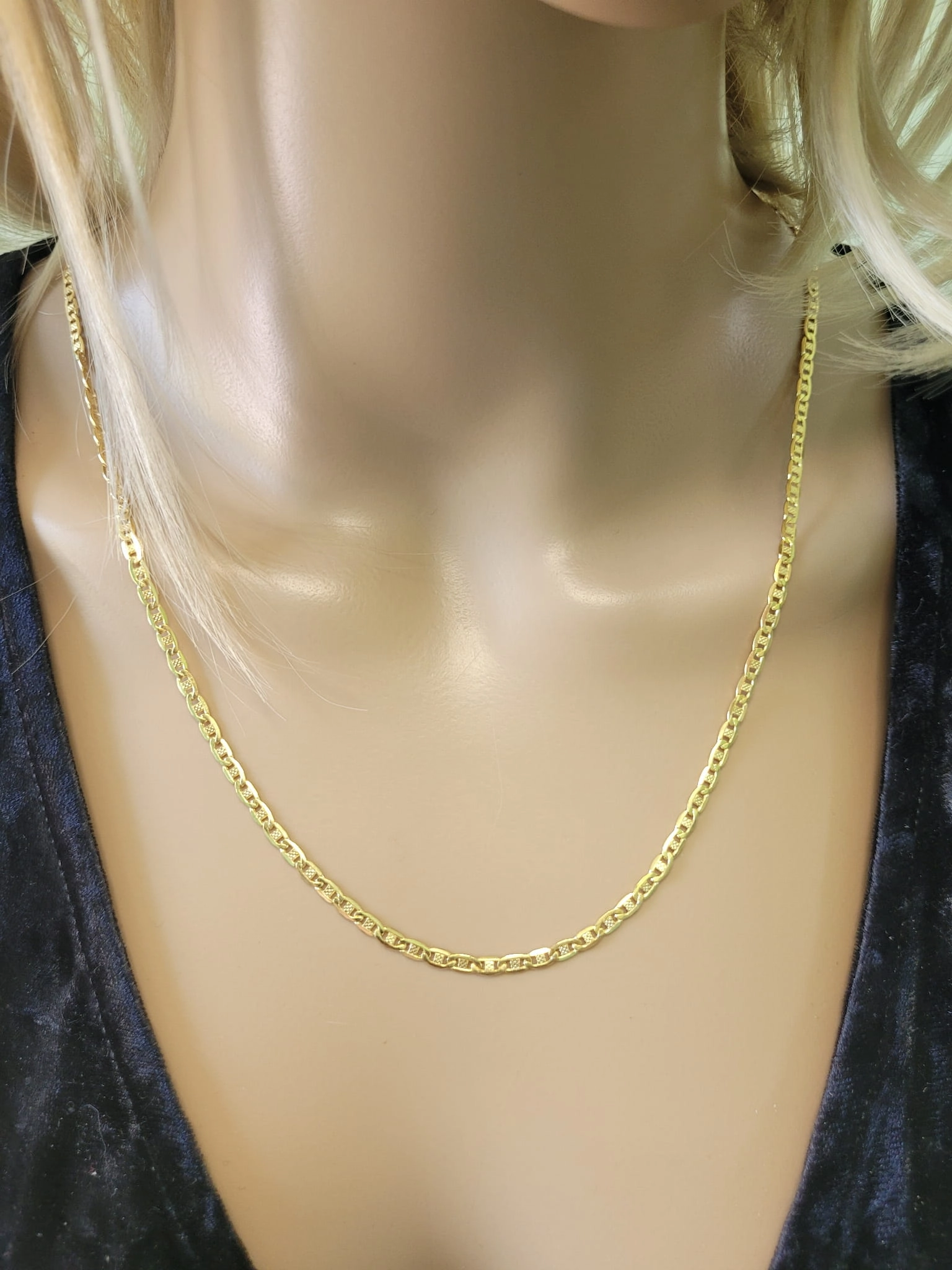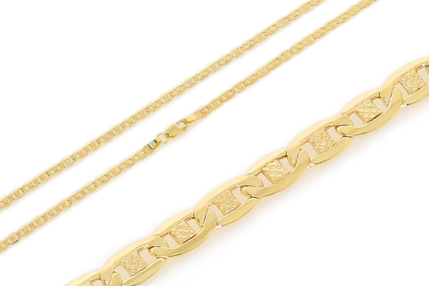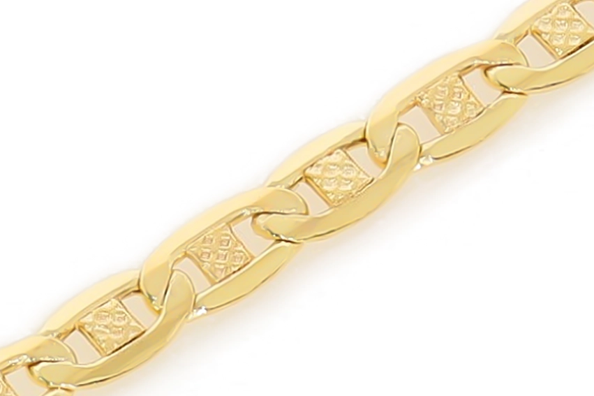 Marina pynimas, pasižymintis savo unikaliais, plokščiais ir ovaliais elementais, suteikia grandinėlei išskirtinį žavesį ir eleganciją. Kiekviena grandies detalė yra kruopščiai apdirbta, sukuriant vizualiai patrauklų raštą, kuris puikiai dera tiek prie kasdienės, tiek prie šventinės aprangos. Nors grandinėlė yra tuščiavidurė, jos plotis – 3,30 mm – užtikrina solidų ir pastebimą įvaizdį, išlaikant lengvumą ir patogumą dėvint.