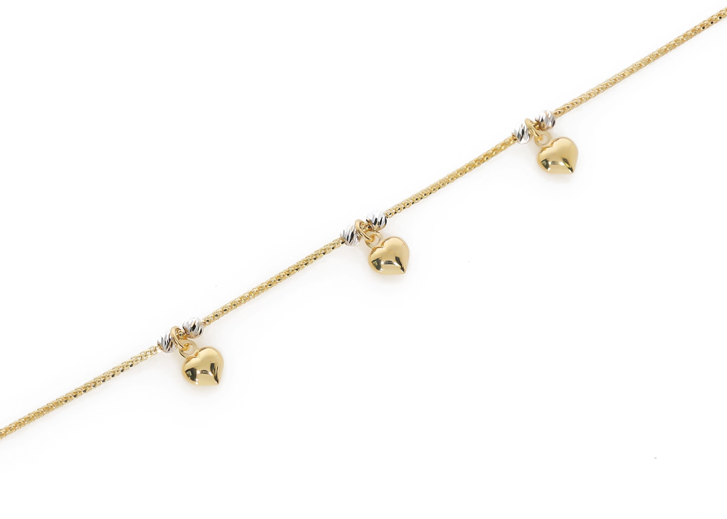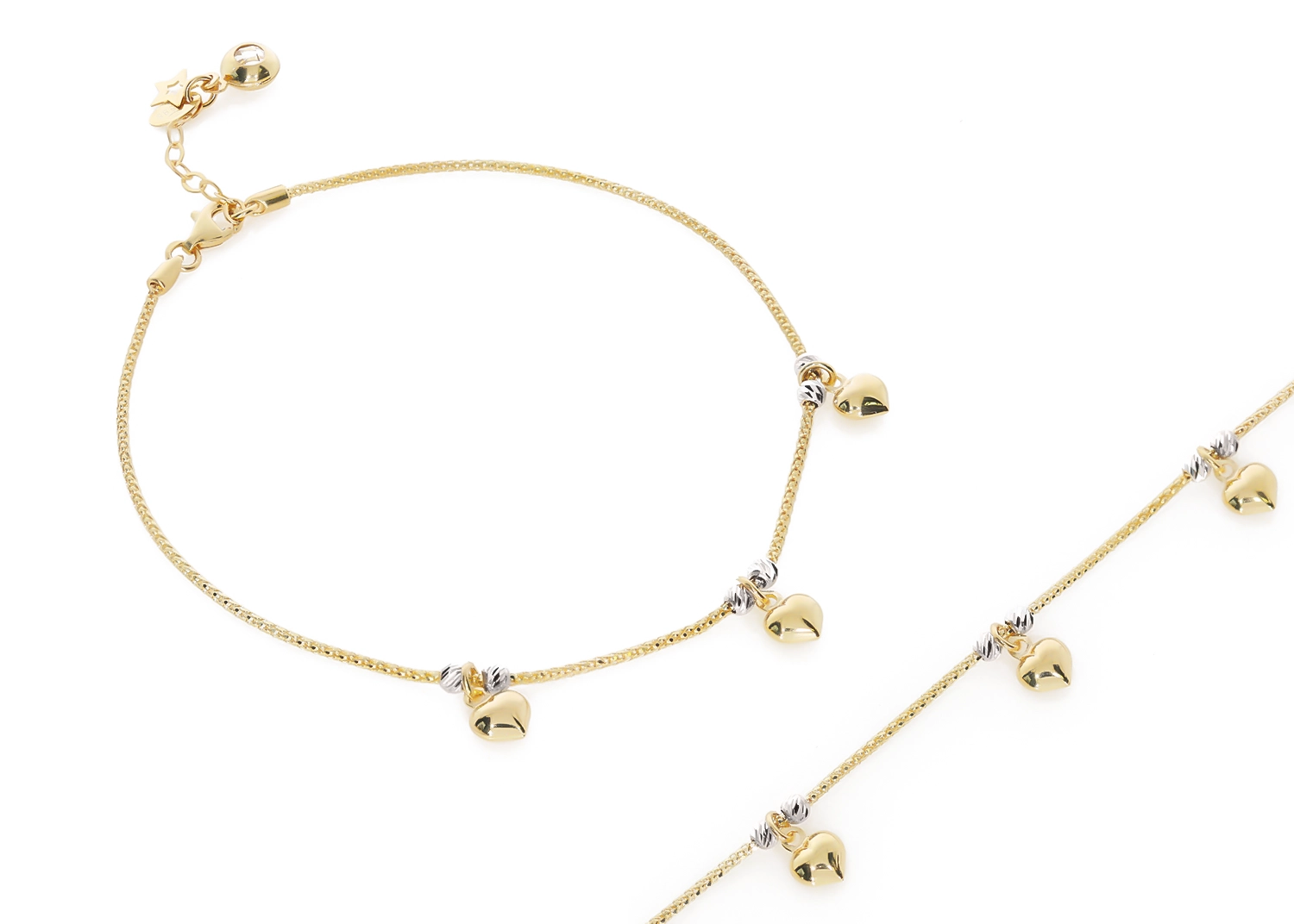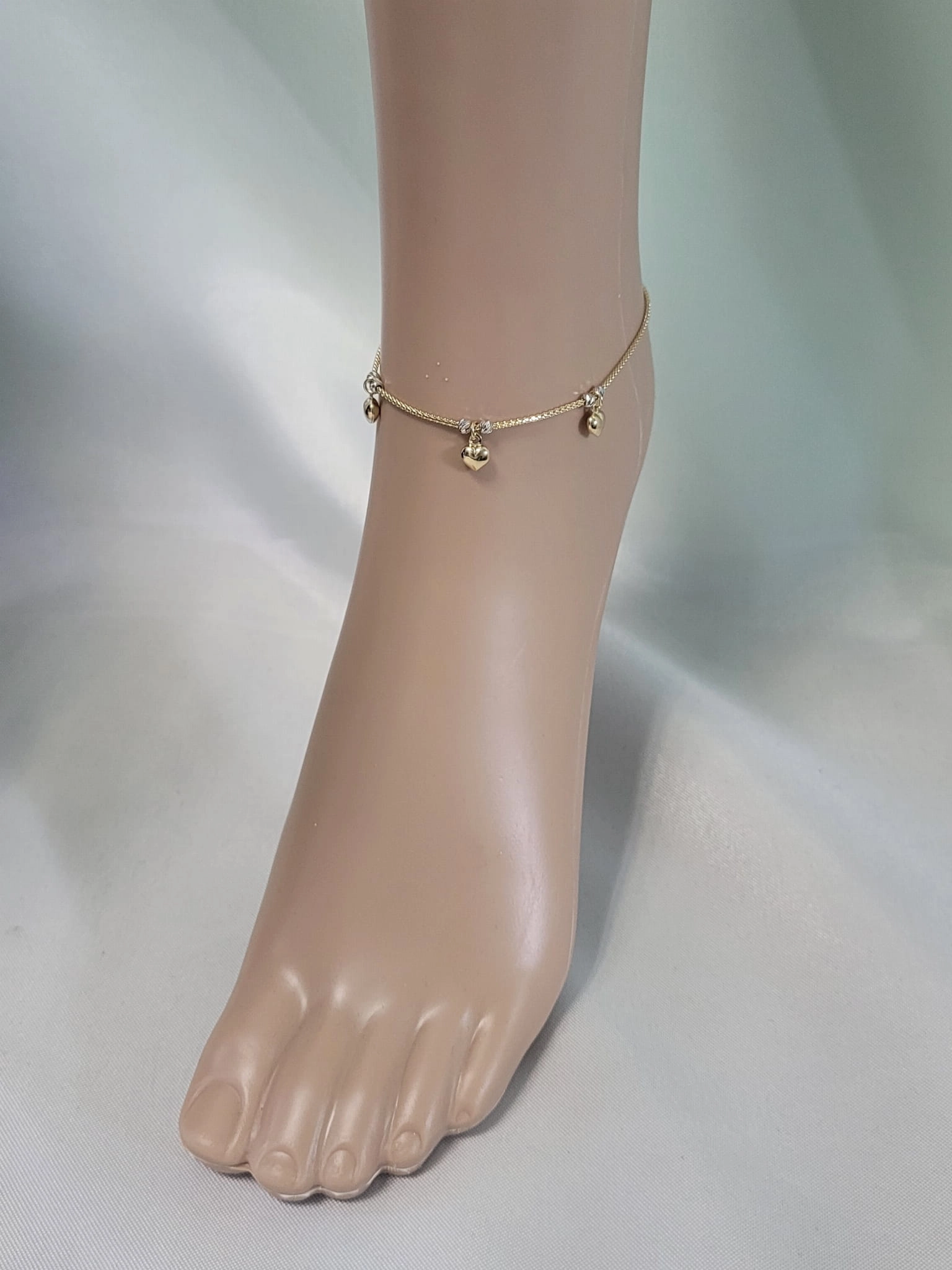 Moteriška geltono ir balto aukso apyrankė ant kojos su širdelėmis 585