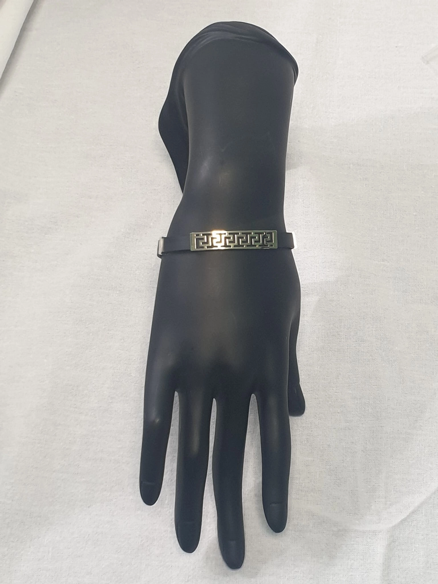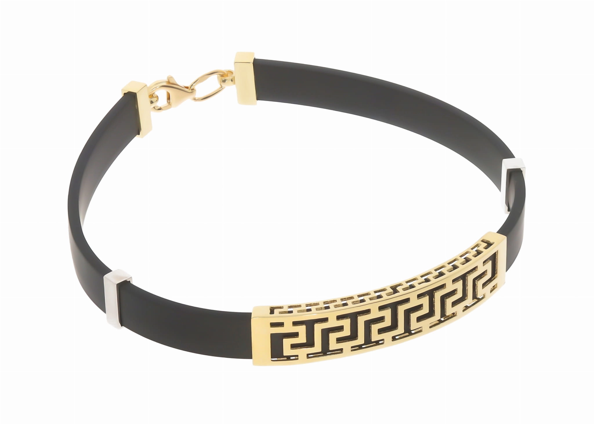 Apyrankės dizainas išsiskiria unikaliu geltono aukso elementu, dekoruotu išraiškingu raštu, kuris suteikia jai išskirtinumo ir prabangos. Šis elementas yra 8 mm pločio ir 4 cm ilgio, puikiai derantis prie 7 mm storio kaučiuko. Balto aukso detalės subtiliai papildo bendrą kompoziciją, suteikdamos apyrankei modernumo ir žavesio. Tai ne tik papuošalas, bet ir stiliaus pareiškimas, pabrėžiantis jūsų individualumą ir rafinuotą skonį.