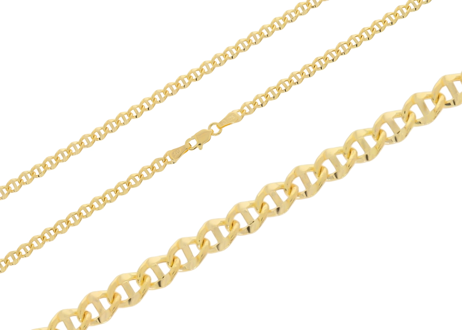 Grandinėlė pasižymi Marina pynimu, kuris suteikia jai unikalumo ir modernumo. Šis pynimas yra žinomas dėl savo tvirtumo ir estetiškumo, o tuščiavidurė konstrukcija leidžia grandinėlei būti lengvai, tačiau išlaikyti prabangų ir solidų įvaizdį. Grandinėlės plotis yra 3,80 mm, todėl ji yra pakankamai pastebima, bet ne per daug masyvi, idealiai tinkanti nešioti tiek vieną, tiek su mėgstamu pakabuku.