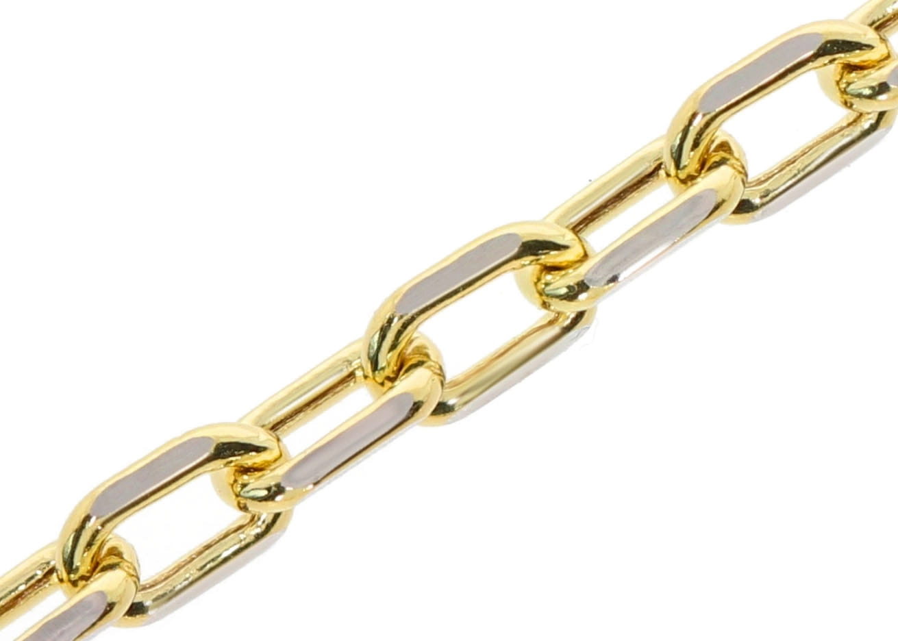 Ši tuščiavidurė grandinėlė pagaminta iš aukščiausios kokybės 585 prabos geltono ir balto aukso, suteikiančio jai išskirtinį dviejų spalvų spindesį. Marina pynimas, pasižymintis stačiakampėmis grandimis, kurios yra iš dalies užpildytos balto aukso intarpais, sukuria žaismingą ir dinamišką dizainą. Grandinėlės plotis – 2,1 mm, todėl ji puikiai tinka nešioti tiek vieną, tiek su mėgstamu pakabuku, pabrėžiant jūsų individualumą ir stilių.