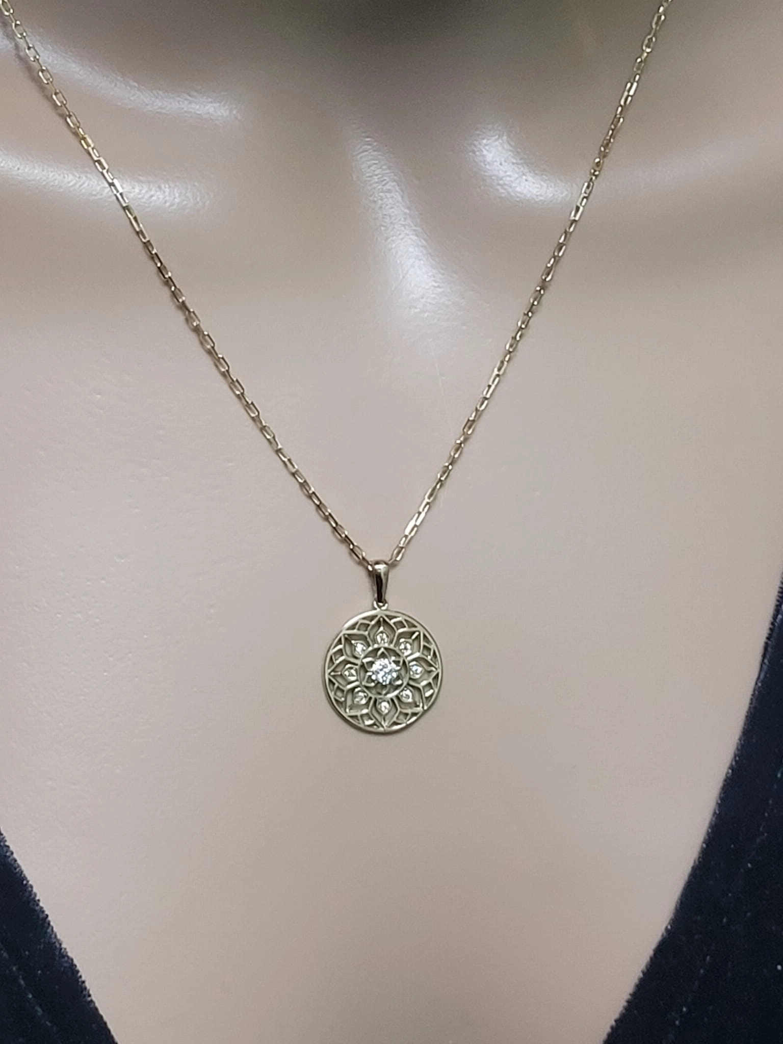 Pakabukas išsiskiria savo apvalia forma ir detaliu, ažūriniu mandala raštu, kurio centre žydi gėlės motyvas, inkrustuotas žėrinčiais baltais cirkoniais. Šie subtilūs akmenėliai suteikia pakabukui papildomo spindesio ir elegancijos, pabrėždami jo išskirtinumą. Su 1,7 cm ilgiu ir 1,7 cm pločiu, šis pakabukas yra pakankamai pastebimas, kad patrauktų akį, tačiau kartu ir subtilus, puikiai tinkantis kasdieniam nešiojimui ar ypatingoms progoms.