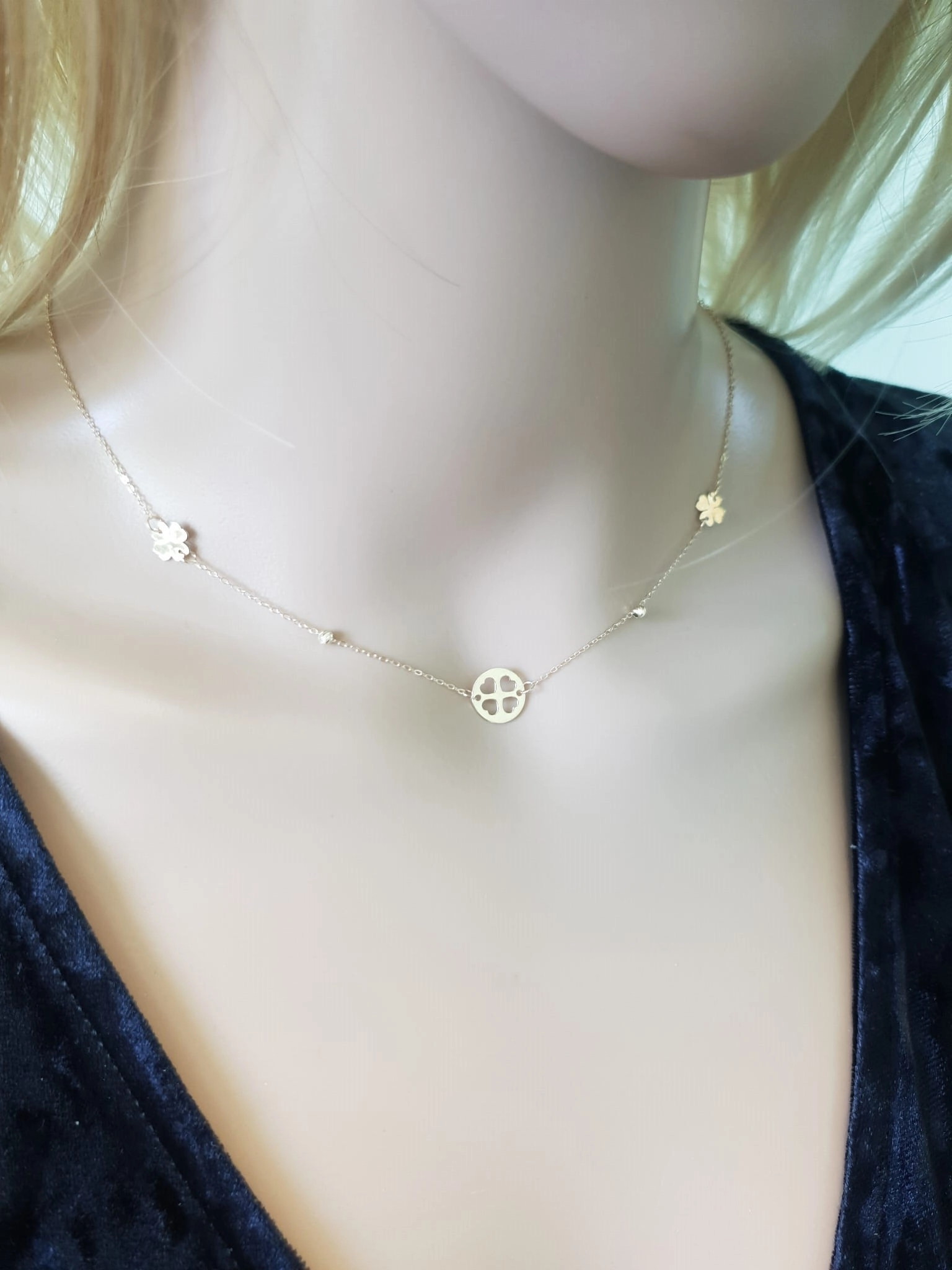 Vėrinio dizainas pasižymi žaismingais elementais: pagrindinis apvalus pakabukas su keturiomis širdelėmis, simbolizuojančiomis meilę ir laimę, bei du mažesni keturlapiai dobilai, įkomponuoti grandinėlės šonuose, kurie suteikia papuošalui sėkmės ir geros kloties simboliką. Be to, smulkūs, raižyti aukso karoliukai, išdėstyti per visą grandinėlės ilgį, suteikia papildomo žavesio ir tekstūros. Šis vėrinys yra universalus – puikiai tinka tiek kasdieniam nešiojimui, tiek ypatingoms progoms, pabrėžiant Jūsų individualumą ir jautrumą naujausioms mados tendencijoms.