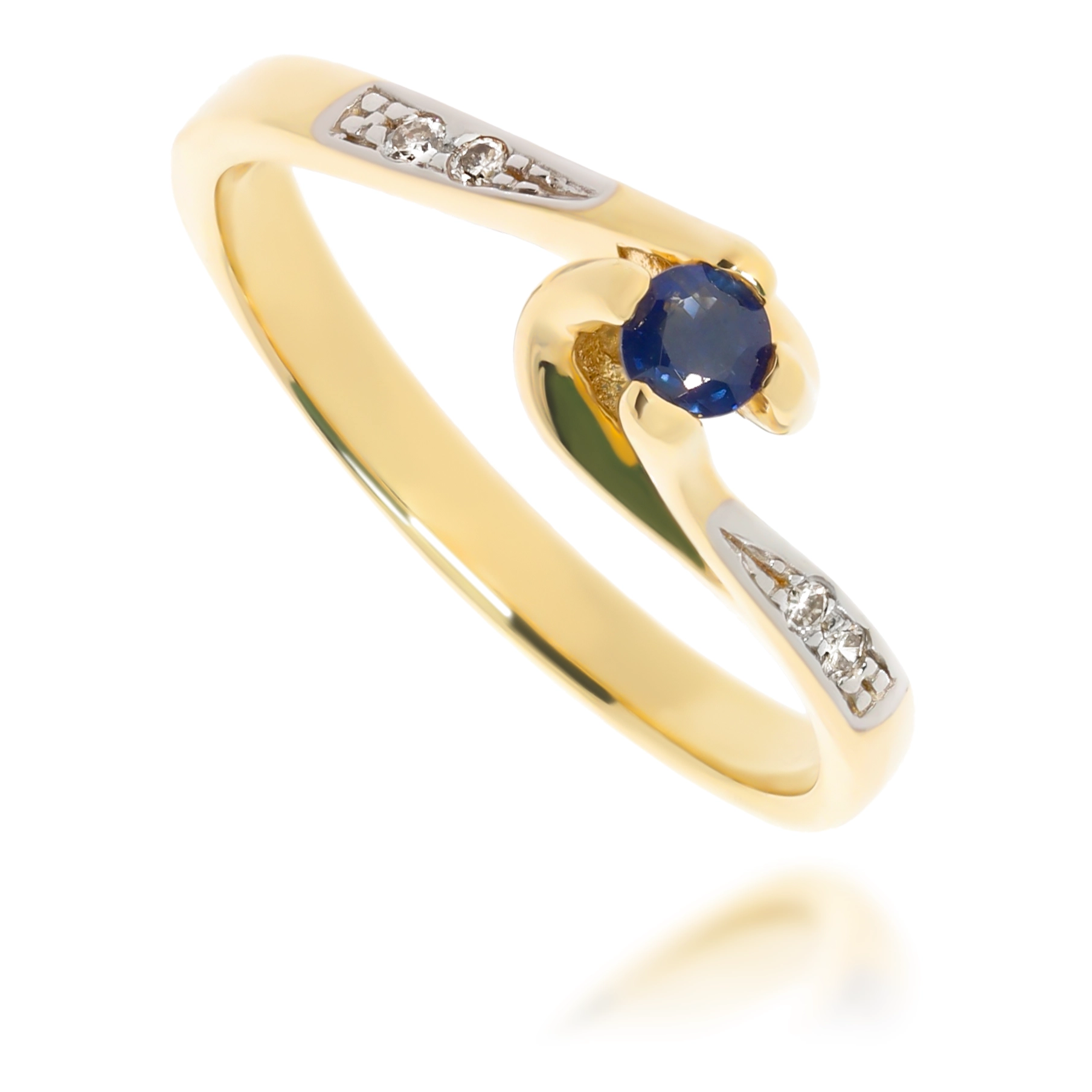 Žiedo centre puikuojasi nuostabus mėlynas safyras, apsuptas žėrinčių deimantų, kurių bendra masė siekia 0,04 ct, o švarumas SI1 ir spalva H. Šie brangakmeniai sukuria harmoningą kontrastą su geltono aukso atspalviu, suteikdami žiedui dar daugiau spindesio. Žiedo briaunos plotis apačioje yra 2,5 mm, o viršutinės dalies plotis/ilgis – 5 mm, kas užtikrina patogų ir stabilų prigludimą. Šis žiedas – tai ne tik papuošalas, bet ir meilės bei atsidavimo simbolis, kuris džiugins Jūsų mylimąją kiekvieną dieną.