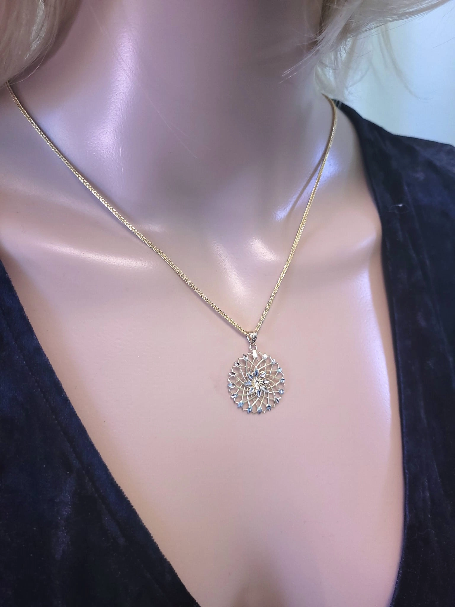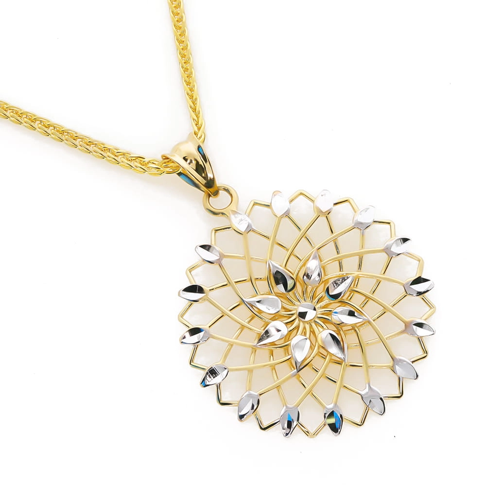 Pakabuko dizainas primena pražydusį gėlės žiedą, kurio spinduliai išsiskleidžia iš centro, sukurdamas subtilų ir dinamišką vaizdą. Geltono aukso karkasas sujungia grakščias linijas, o balto aukso detalės, išdėstytos tarsi rasos lašeliai ant žiedlapių, suteikia pakabukui modernumo ir žaismingumo. Šis derinys sukuria išskirtinį kontrastą, kuris pabrėžia kiekvienos detalės grožį ir atspindi šviesą su kiekvienu judesiu.