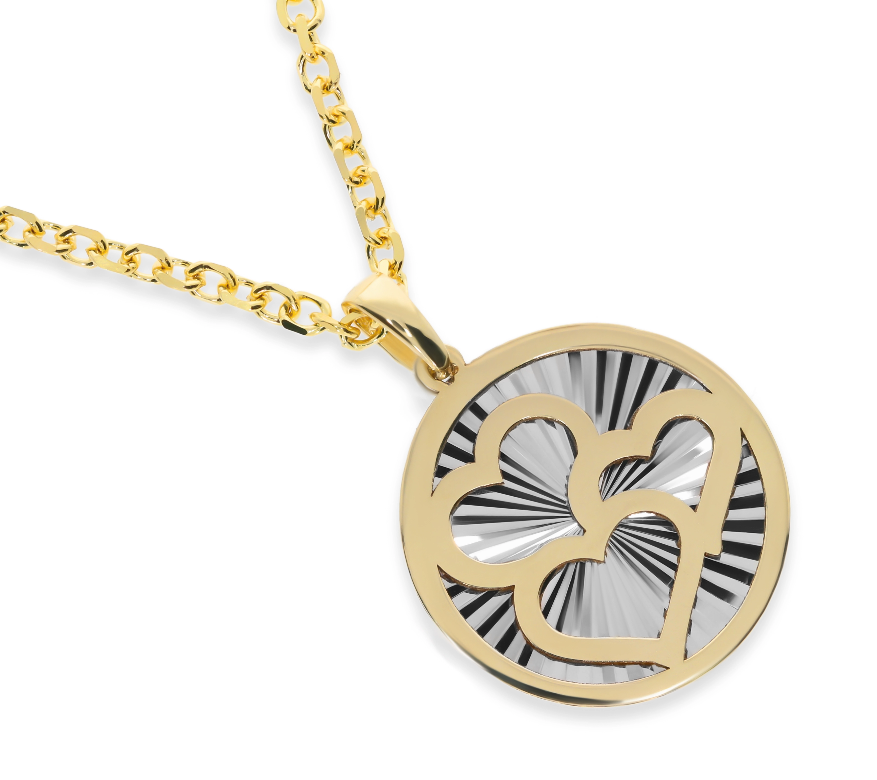 Atraskite žavesį su šiuo išskirtiniu geltono ir balto aukso pakabuku, kuris įkūnija meilę ir eleganciją. Šis apvalios formos pakabukas, kurio skersmuo yra 1,7 cm, yra pagamintas iš aukščiausios kokybės 585 prabos aukso, garantuojančio ilgaamžiškumą ir nepriekaištingą spindesį. Jo dizainas pasižymi subtiliai išpjaustytomis širdelėmis, kurios sukuria romantišką ir modernų įvaizdį, o balto aukso spinduliai suteikia pakabukui gilumo ir išskirtinumo.