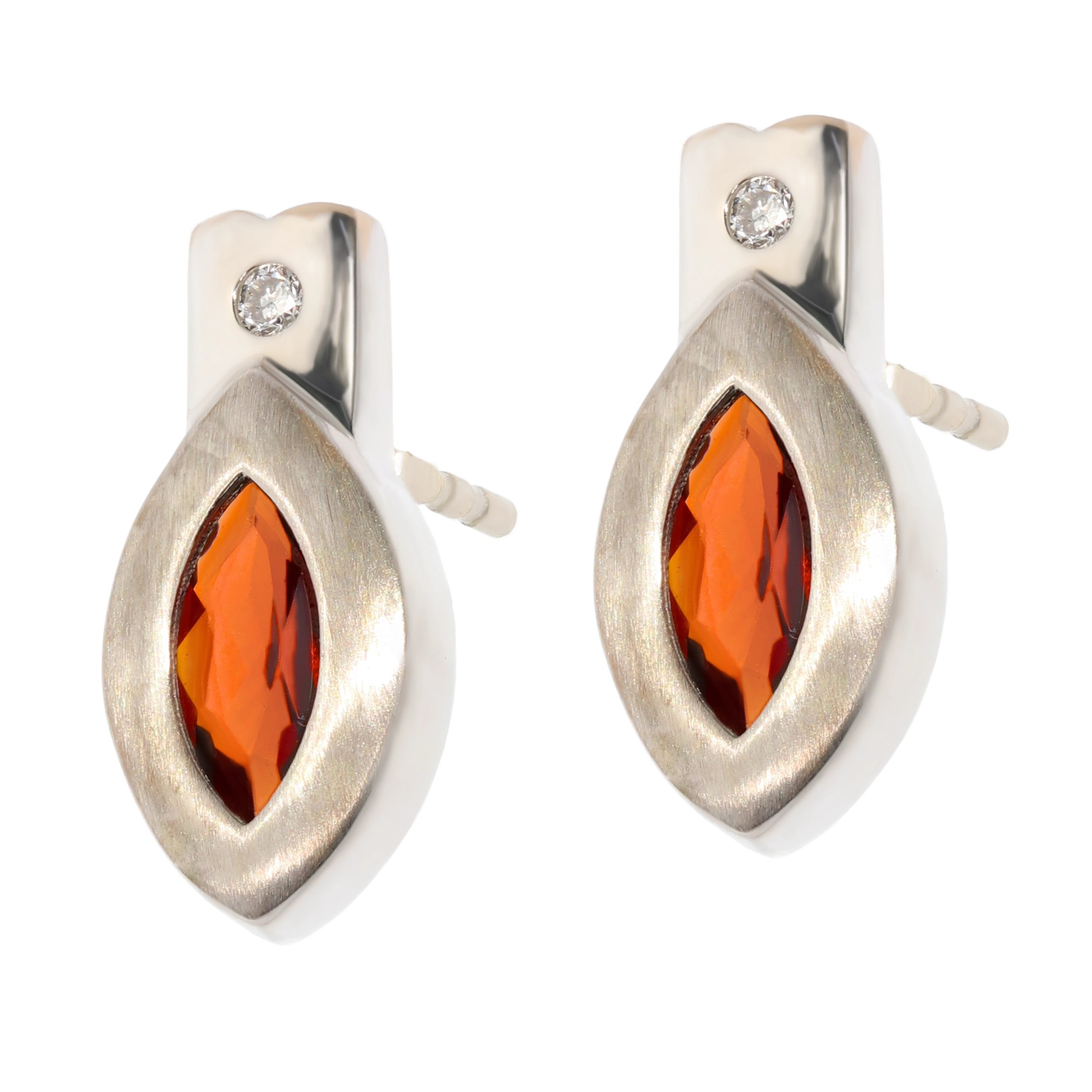 Auskarai pagaminti iš 585 prabos baltojo aukso, kuris suteikia jiems modernumo ir prabangos. Kiekviename auskare įtvirtintas rubinas, kurio sodri oranžinė spalva sukuria išskirtinį kontrastą su baltu auksu ir šalia esančiais deimantais. Deimantai, kurių bendra masė siekia 0,03 ct, pasižymi SI švarumu ir J spalva, užtikrinančia subtilų, bet pastebimą spindesį. Auskarų ilgis yra 1,50 cm, o plotis – 7 mm, todėl jie puikiai tinka kasdieniam nešiojimui ir ypatingoms progoms. Patogus smeigtuko užsegimas garantuoja saugumą ir komfortą.