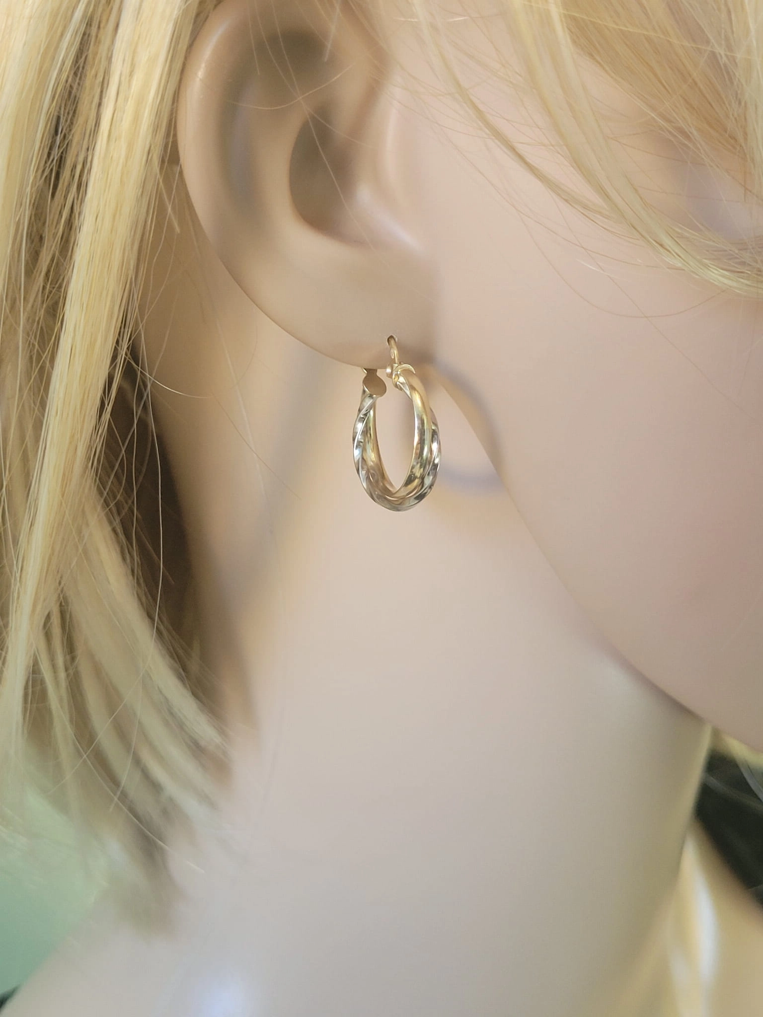 Šie išskirtiniai auskarai pagaminti iš aukščiausios kokybės 585 prabos aukso, derinant klasikinį geltoną auksą su moderniu baltu auksu. Šis derinys sukuria subtilų kontrastą ir žavingą susuktą dizainą, kuris traukia akį ir suteikia papuošalui dinamiškumo. Auskarų skersmuo yra 1,88 cm, o plotis – 4,0 mm, todėl jie puikiai tinka tiek kasdieniam nešiojimui, tiek ypatingoms progoms. Jų universalus dizainas leidžia juos derinti prie įvairių aprangos stilių – nuo klasikinio iki modernaus.