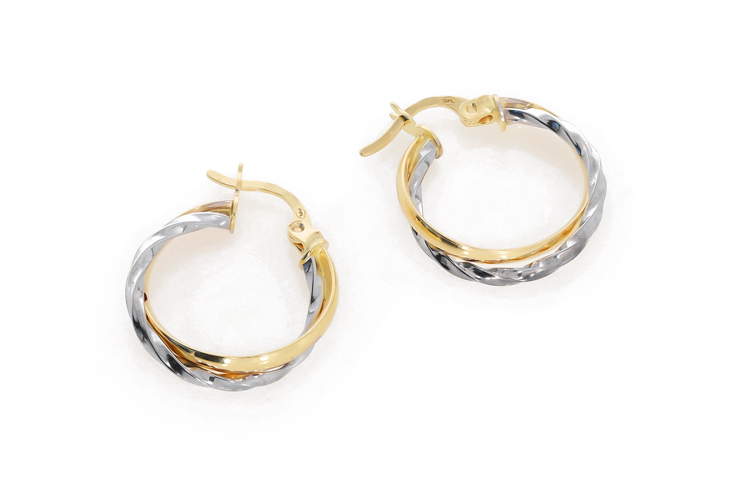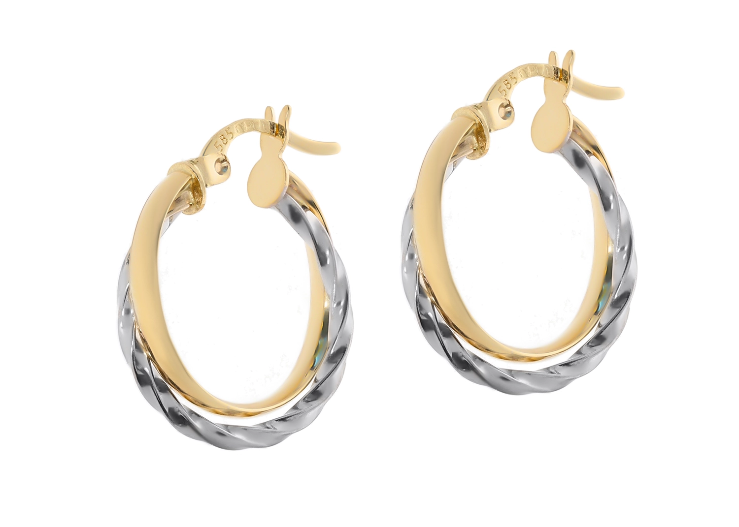 Moteriški dviejų spalvų aukso susukti auskarai lankeliai 585