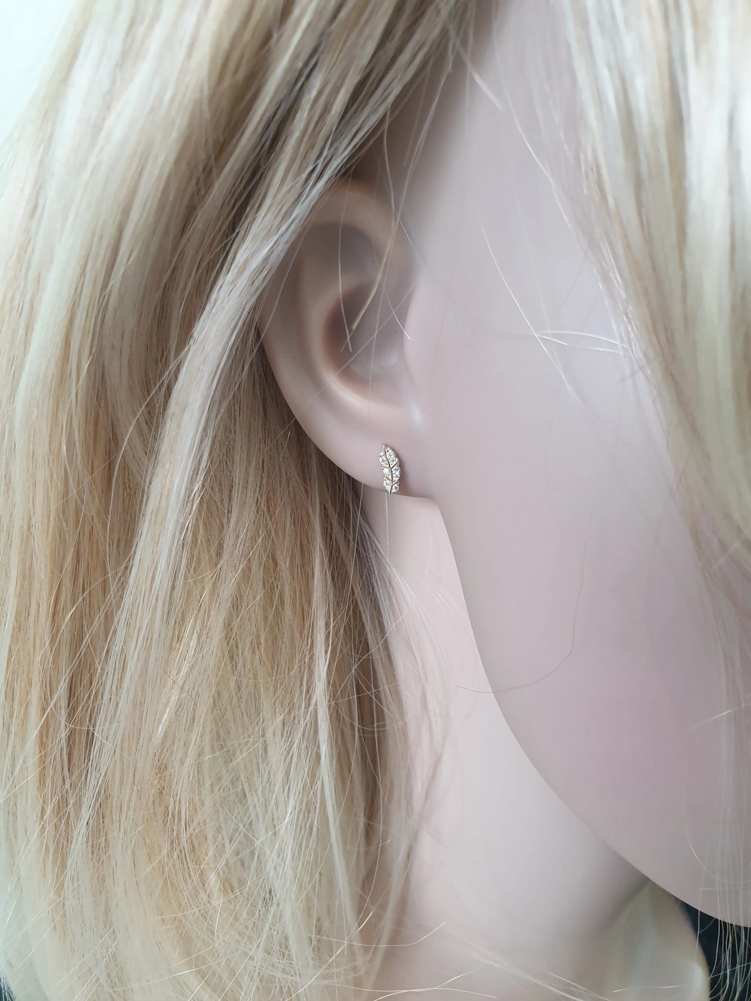 Kiekvienas auskaras yra kruopščiai suformuotas kaip stilizuotas lapelis, kurio paviršius inkrustuotas žėrinčiais baltais cirkoniais. Šie akmenys suteikia auskarams išskirtinio spindesio, atspindėdami šviesą su kiekvienu judesiu ir sukurdami kerintį žvilgesį. Auskarų matmenys – ilgis 9 mm, plotis 3 mm – idealiai tinka kasdieniam nešiojimui, suteikiant subtilumo ir rafinuotumo, bet kartu puikiai tinka ir ypatingoms progoms, kai norisi pabrėžti savo išskirtinumą ir eleganciją.