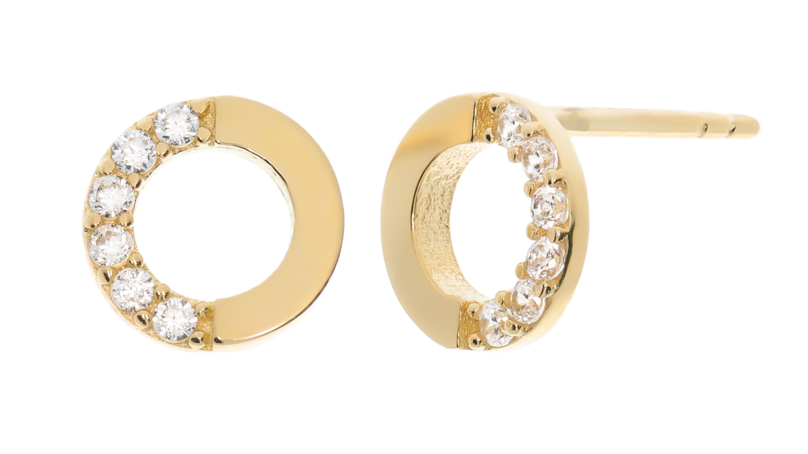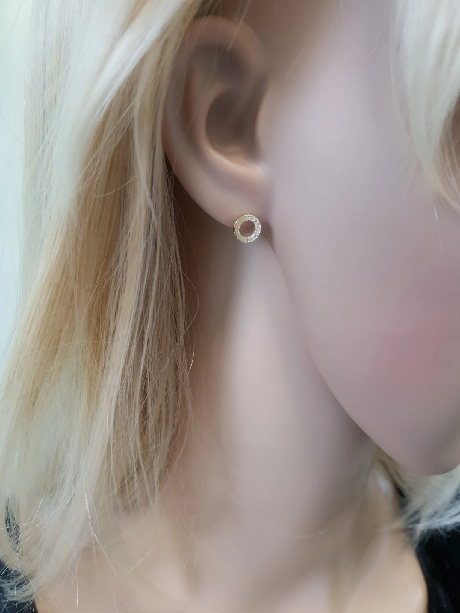 Kiekvienas auskaras yra kruopščiai sukurtas kaip apvalus ratukas, kurio viena pusė puošta žėrinčiais baltais cirkoniais, o kita – lygiu, poliruotu auksu. Šis dizainas sukuria žaismingą kontrastą ir leidžia auskarams subtiliai spindėti, atspindint šviesą su kiekvienu judesiu. Jų klasikinis, bet kartu modernus stilius puikiai dera prie įvairių aprangos derinių – nuo kasdienio iki šventinio. Auskarų skersmuo yra 7,5 mm, todėl jie yra pakankamai pastebimi, bet ne per dideli, idealiai tinkantys kasdieniam nešiojimui ar ypatingoms progoms.