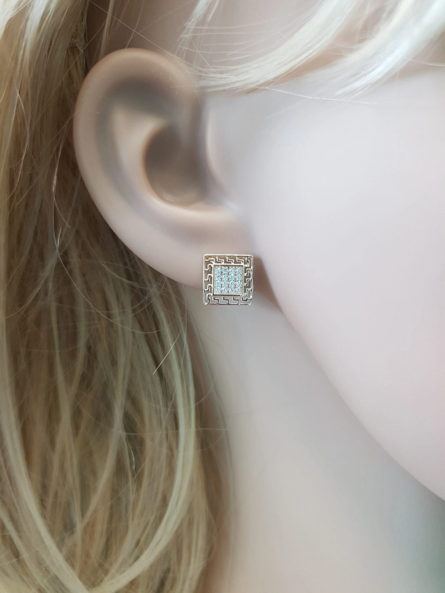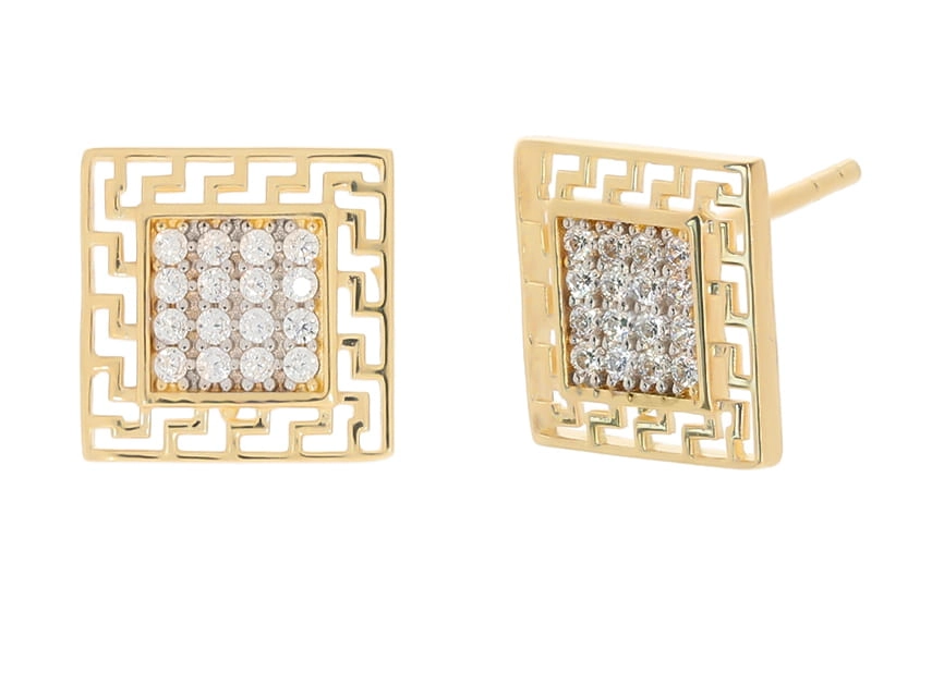 Šie auskarai pagaminti iš aukščiausios kokybės 585 prabos geltono aukso, kuris spinduliuoja šiluma ir prabanga. Jų dizainas įkvėptas geometrinių raštų ir modernios klasikos, suteikiant jiems išskirtinį ir atpažįstamą charakterį. Kvadratinė forma su ažūriniu rėmeliu, primenančiu graikiškus ornamentus, sukuria žaismingą, bet kartu ir solidų įvaizdį. Centrinėje dalyje išdėstyti žėrintys balti cirkoniai, kurie tobulai imituoja deimantų spindesį, suteikdami auskarams prabangos ir akinančio žavesio. Jų išmatavimai – ilgis 1 cm, plotis 1 cm – idealiai tinka kasdieniam nešiojimui ar ypatingoms progoms, pabrėžiant jūsų veido bruožus ir suteikiant jums pasitikėjimo savimi.