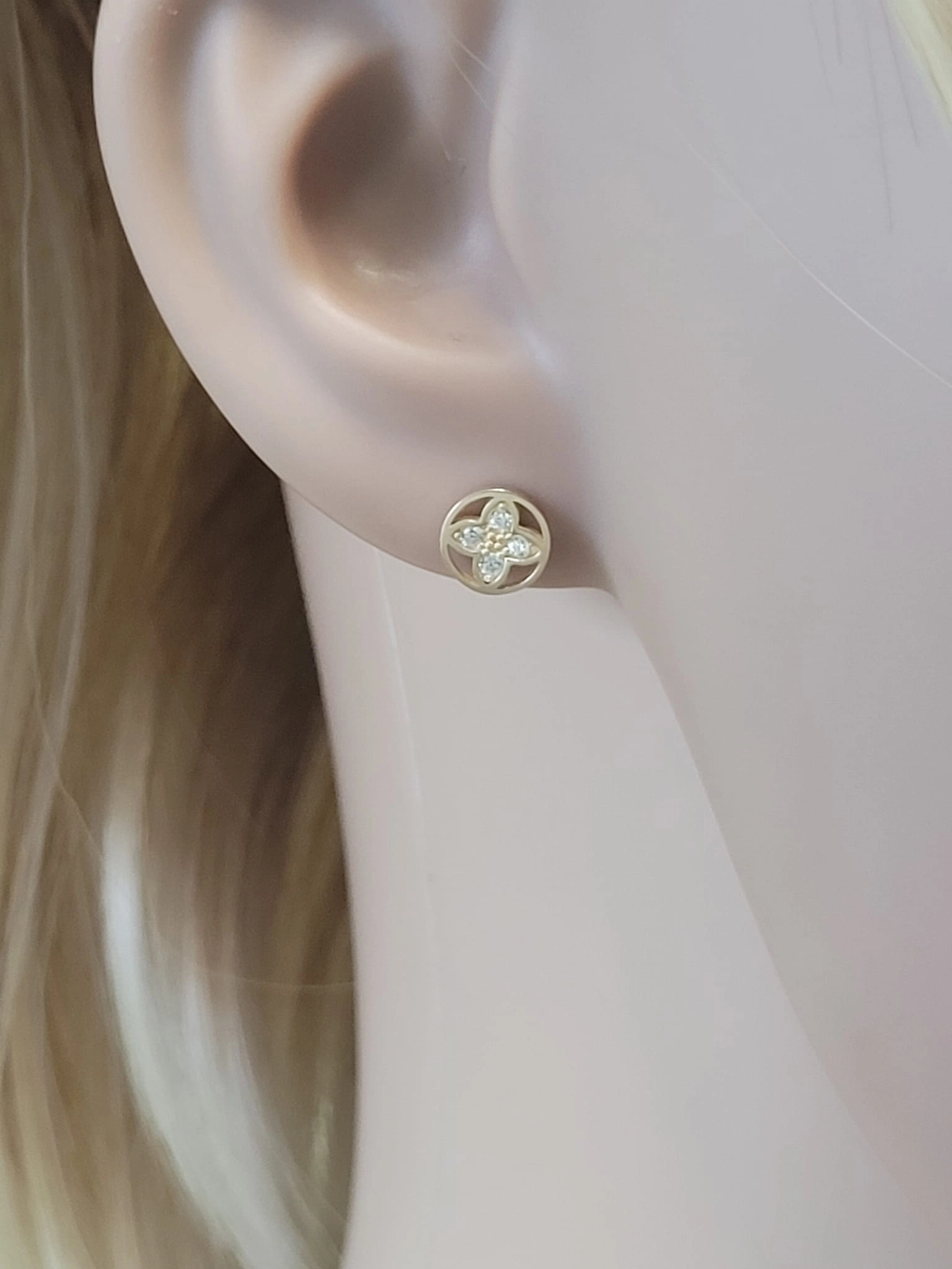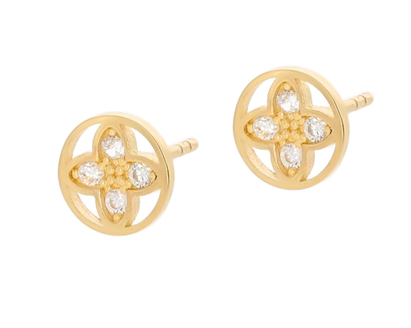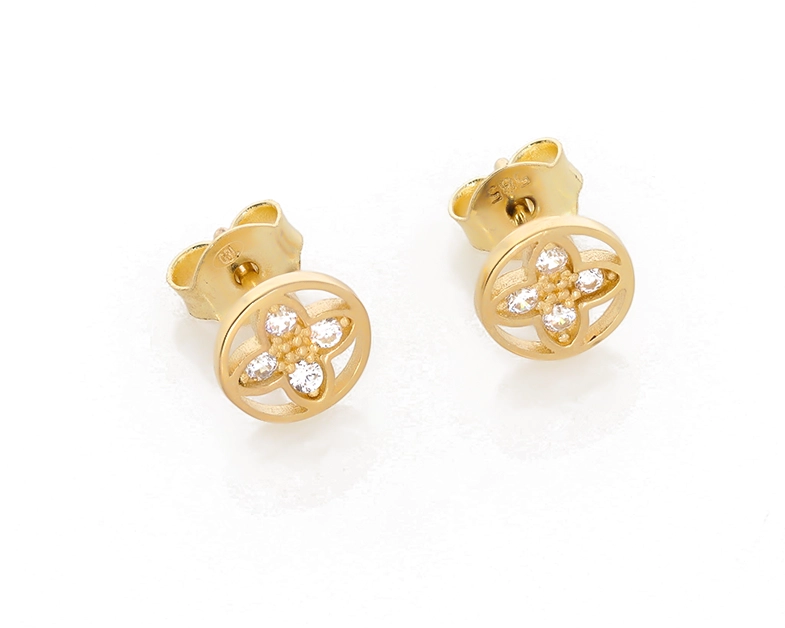 Šie moteriški auskarai, pagaminti iš aukščiausios kokybės 585 prabos geltono aukso, pasižymi unikaliu dizainu. Kiekvienas auskaras yra apskritimo formos, kurio viduje išraižytas stilizuotas keturlapis dobilas, simbolizuojantis sėkmę ir laimę. Šio dobilėlio lapeliai papuošti spindinčiais baltais cirkoniais, kurie atspindi šviesą ir suteikia auskarams kerinčio žavesio. Auskarų skersmuo yra 7,30 mm, todėl jie puikiai tinka tiek kasdieniam nešiojimui, tiek ypatingoms progoms.