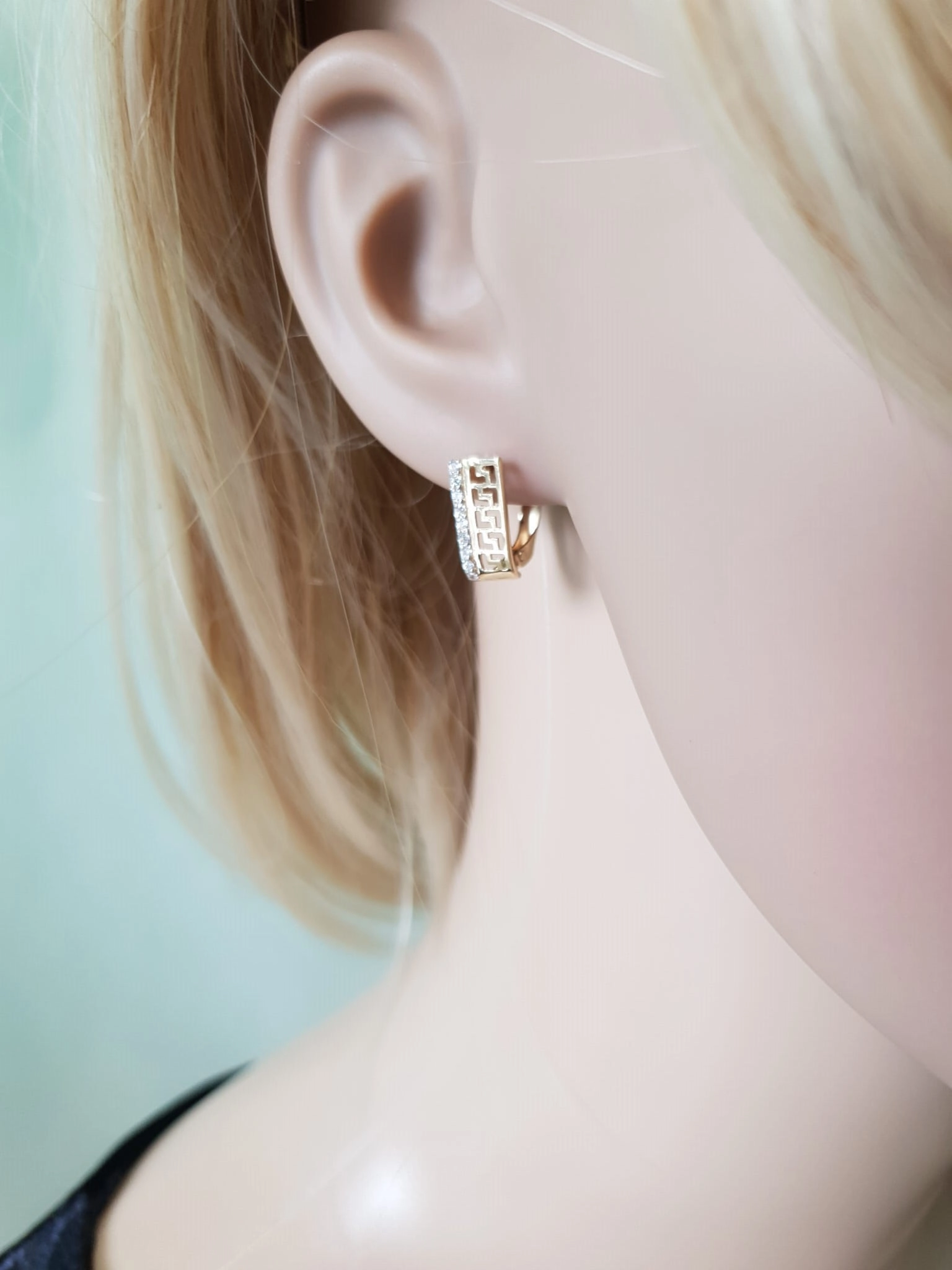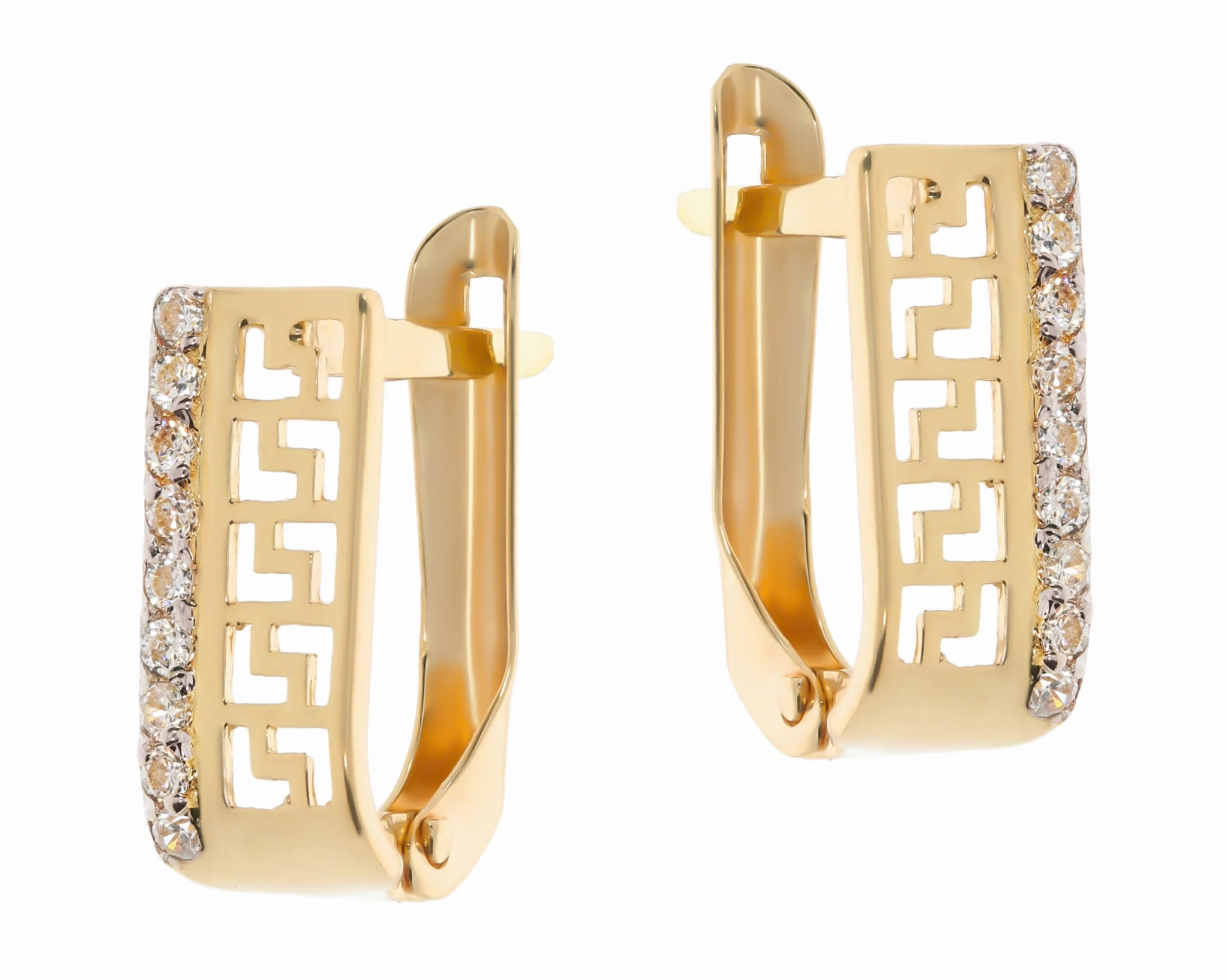 Moteriški geltono aukso auskarai su cirkoniais ir graikišku raštu 585