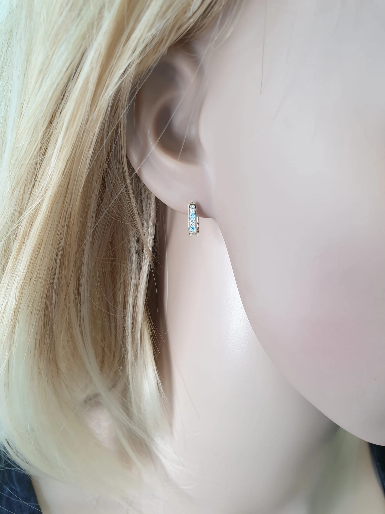 Auskarų dizainas išsiskiria subtilia elegancija: jų ilgis siekia 1,1 cm, o plotis – 2,8 mm. Kiekvienas auskaras puoštas žėrinčiais cirkoniais, kurie kaitaliojasi mėlynos ir baltos spalvos atspalviais, sukuriančiais žaismingą ir akį traukiantį kontrastą. Šie cirkoniai atspindi šviesą su kiekvienu judesiu, suteikdami Jūsų veidui papildomo švytėjimo ir žavesio. Tai puiki dovana moteriai, kuri vertina klasikinį stilių su moderniu akcentu ir nori pabrėžti savo individualumą bei rafinuotumą.