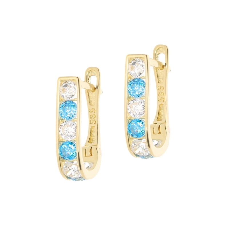 Moteriški geltono aukso auskarai su mėlynais ir baltais cirkoniais 585