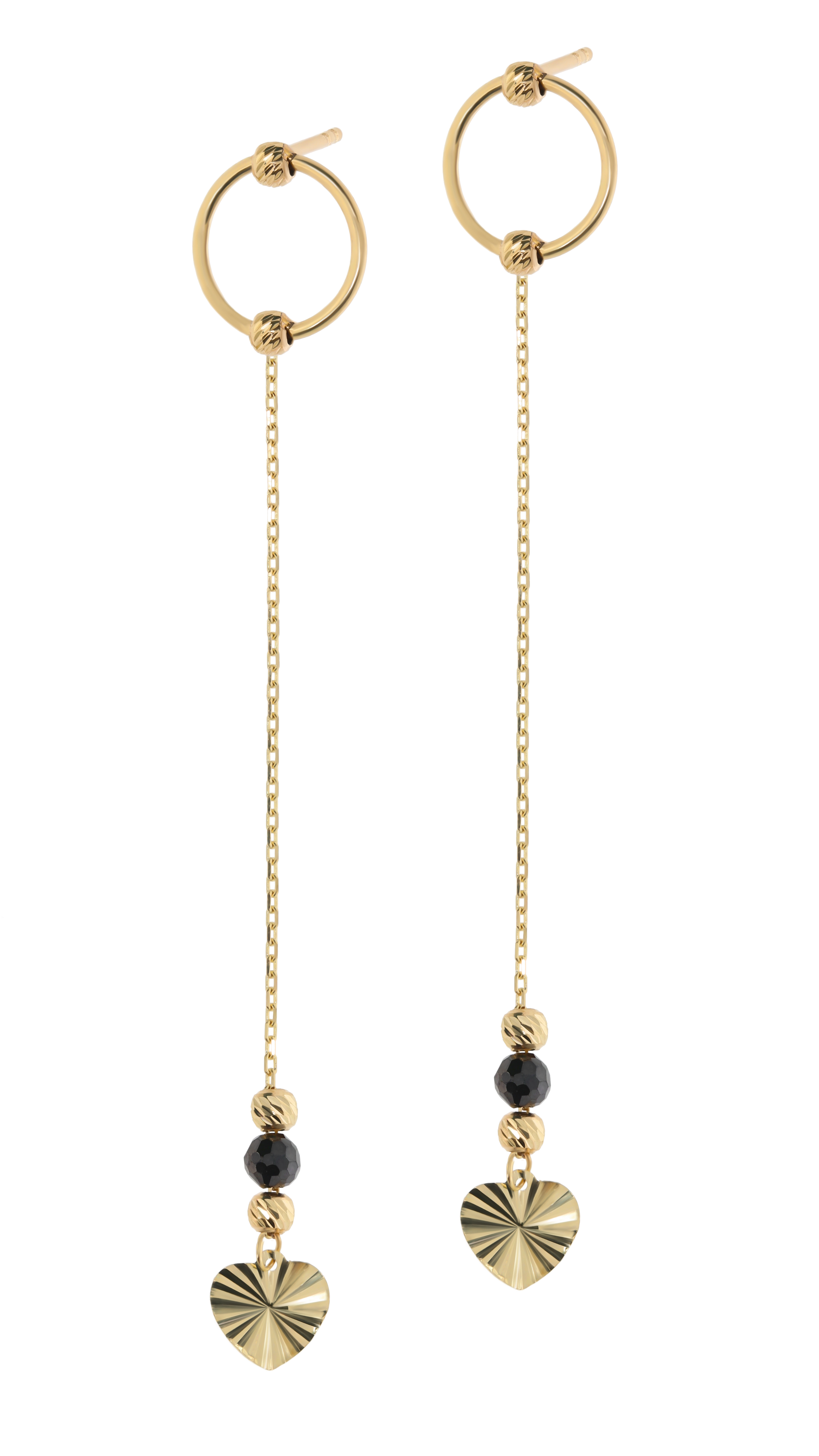 Šie auskarai – tai ilgos, grakščios grandinėlės, kurios švelniai supasi su kiekvienu Jūsų judesiu. Viršutinėje dalyje esantis apvalus geltono aukso lankelis suteikia klasikinio modernumo, o žemiau kabantys juodi cirkoniai ir širdelės formos auksiniai elementai su išraiškingu raštu sukuria žaismingą ir romantišką įspūdį. Auskarų ilgis siekia 7 cm, o plotis – 6,5 mm, todėl jie puikiai tinka tiek kasdieniam įvaizdžiui, tiek ypatingoms progoms. Pagaminti iš aukščiausios kokybės 585 prabos geltono aukso, šie auskarai taps Jūsų mėgstamiausiu aksesuaru, kuris spindės ir džiugins ilgus metus. Tai puiki dovana sau ar brangiam žmogui, norint išreikšti meilę ir dėmesį.