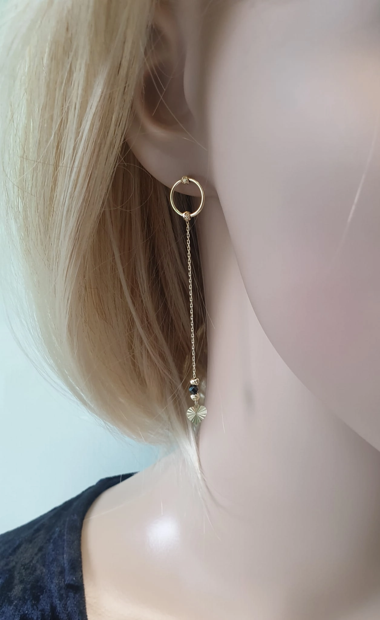 Moteriški geltono aukso kabantys auskarai su juodais cirkoniais 585