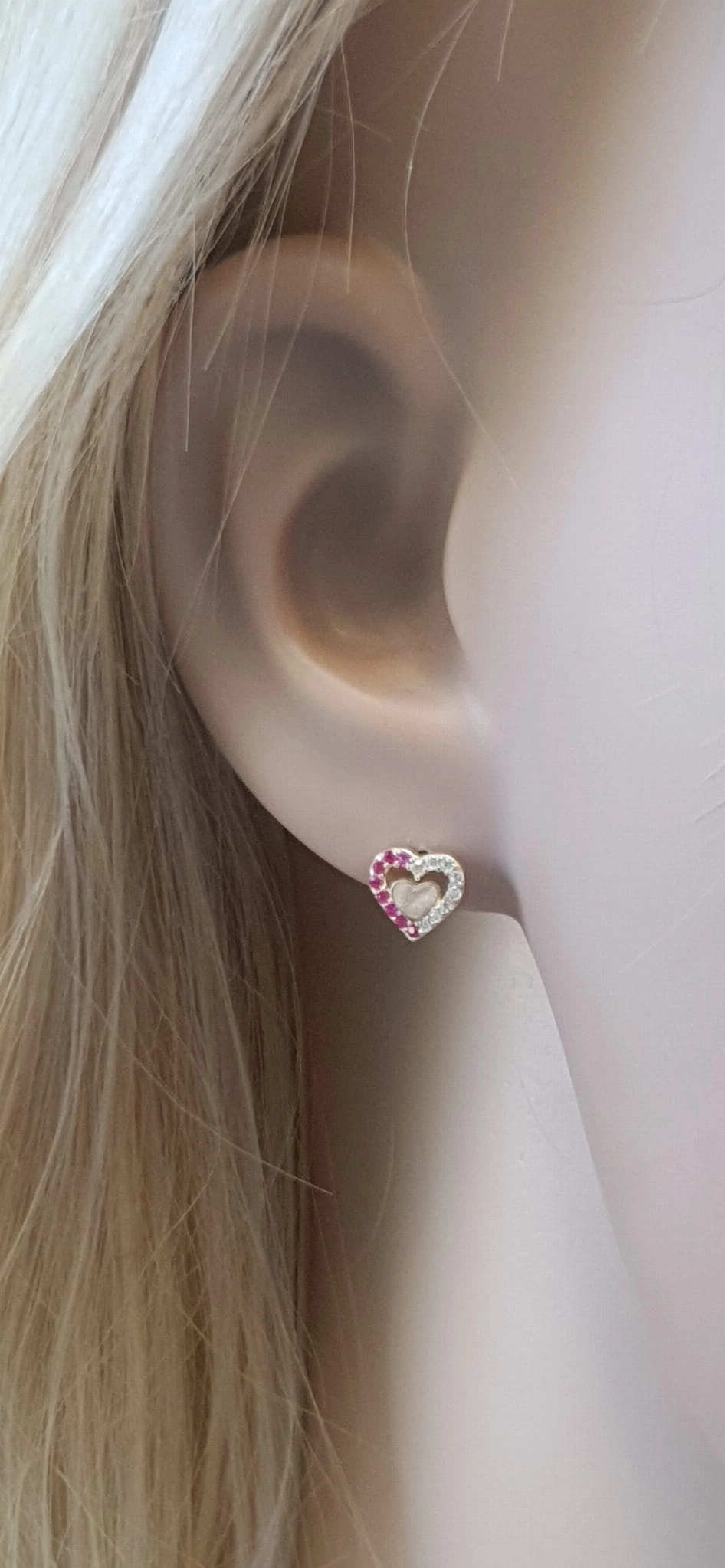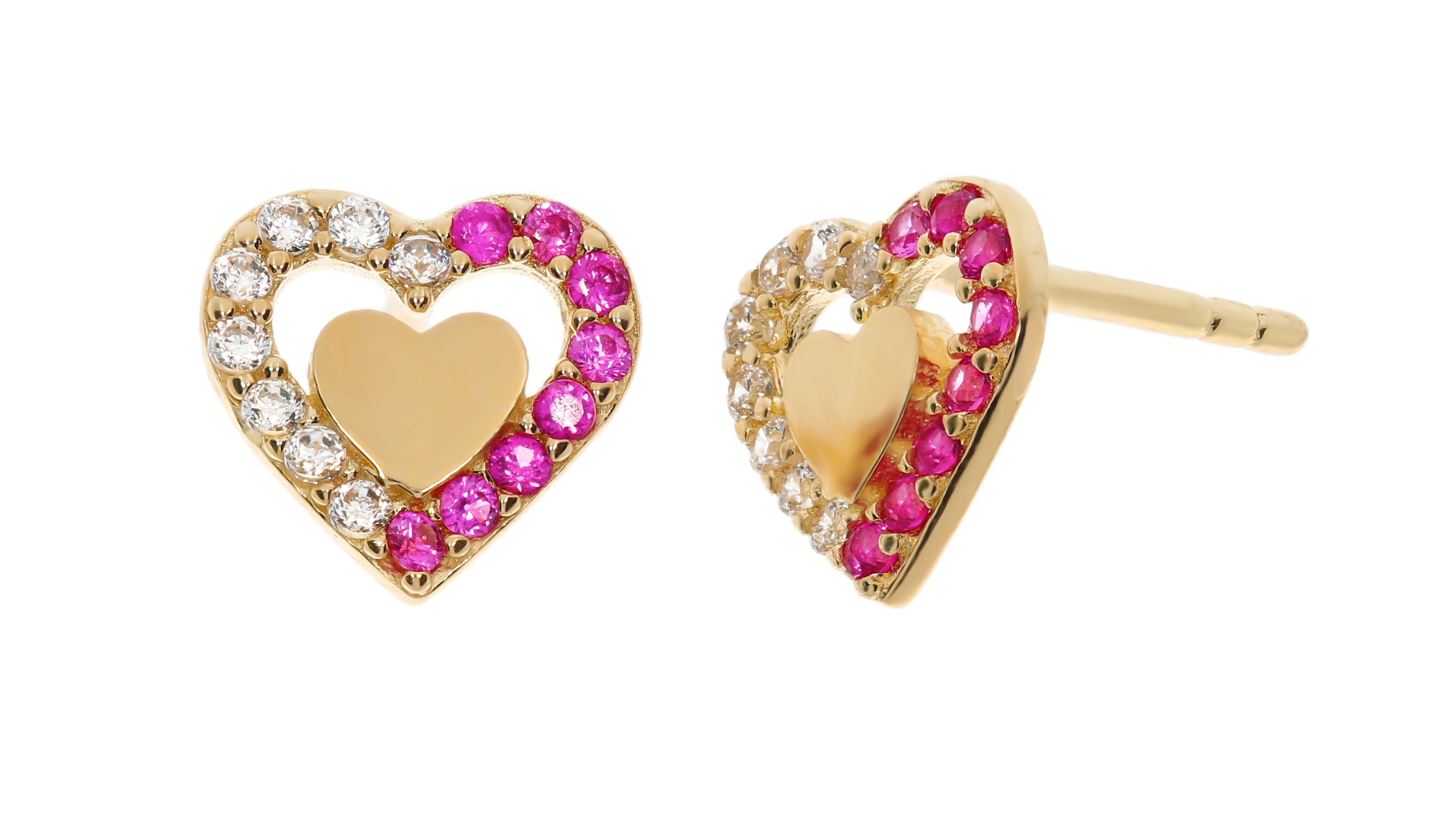 Kiekvienas auskaras suformuotas kaip dviguba širdelė: vidinė širdelė yra poliruoto geltono aukso, o išorinė – apsupta spindinčių cirkonių. Viena pusė išorinės širdelės puošta skaidriais, baltais cirkoniais, o kita – ryškiais, fuksijos spalvos cirkoniais, kurie suteikia auskarams gyvybingumo ir išskirtinumo. Šis unikalus dizainas sukuria subtilų, bet įsimintiną kontrastą, priverčiantį auskarus spindėti ir traukti žvilgsnius.