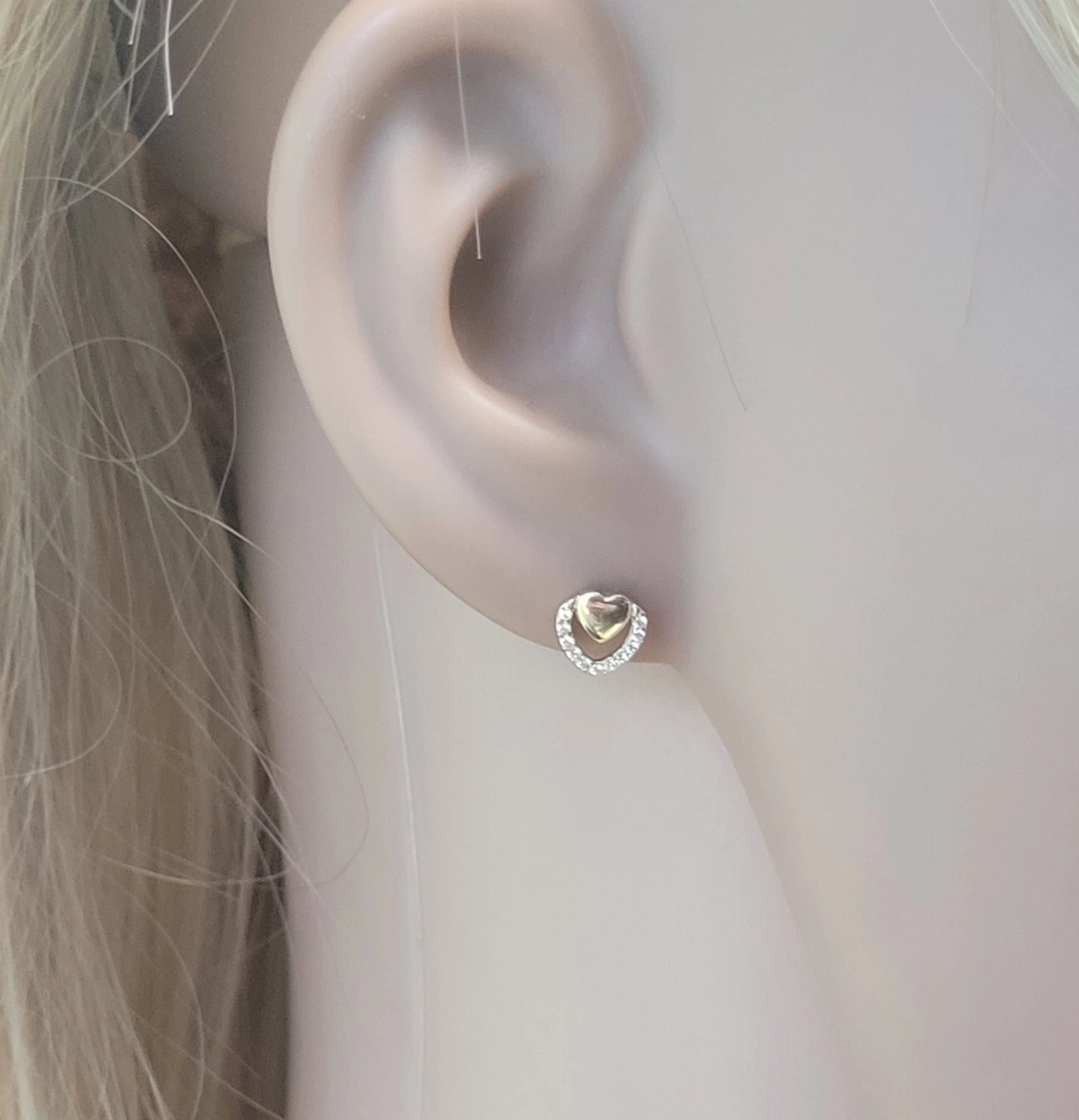 Kiekvienas auskaras yra kruopščiai suformuotas į žavingą širdelės formą, kurios viduryje puikuojasi blizgi auksinė širdelė, o aplink ją – eilė spindinčių baltų cirkonių. Šis dizainas sukuria išskirtinį šviesos žaismą, priverčiantį auskarus atrodyti dar prabangiau ir elegantiškiau. Jų matmenys – 6,7 mm pločio ir 6,7 mm ilgio – idealiai tinka kasdieniam nešiojimui ar ypatingoms progoms, suteikiant jūsų įvaizdžiui romantikos ir žavesio.