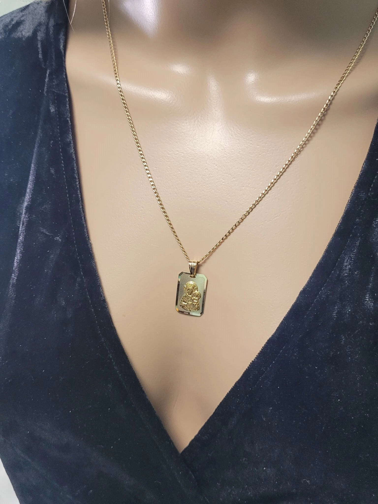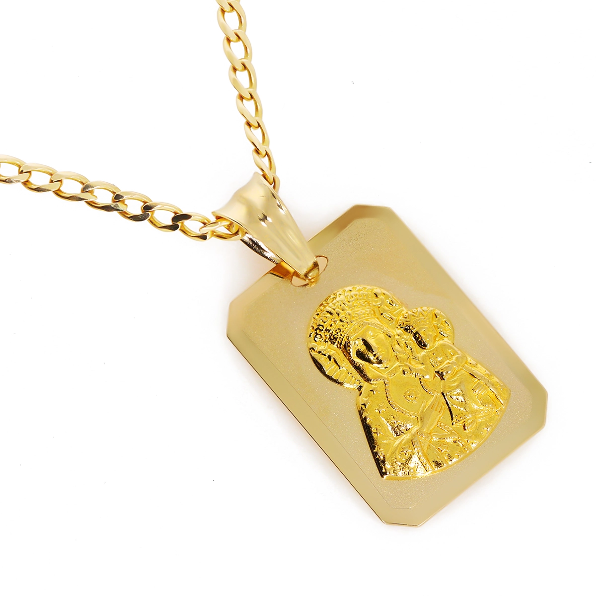 Pakabukas išsiskiria savo klasikine, bet kartu ir modernia stačiakampio forma su subtiliai nusklembtais kraštais, suteikiančiais jam rafinuotumo. Centrinėje dalyje išraižytas Dievo Motinos su Kūdikiu atvaizdas, atliktas su ypatingu kruopštumu ir dėmesiu detalėms, sukuria gilų ir prasmingą įspūdį. Šis medalikėlis puikiai tinka tiek vyrams, tiek moterims, ieškantiems ne tik stilingo, bet ir prasmingo aksesuaro.