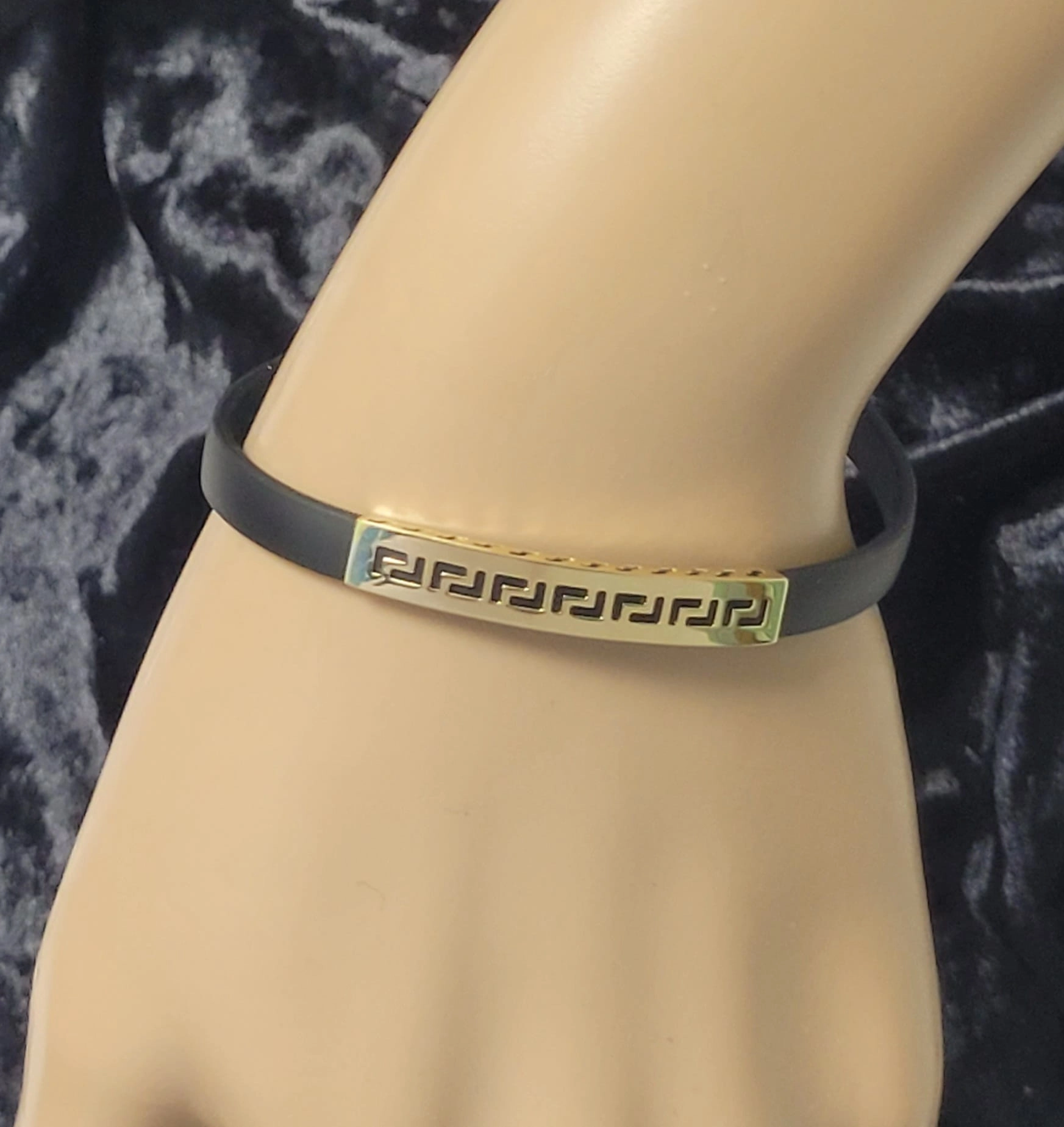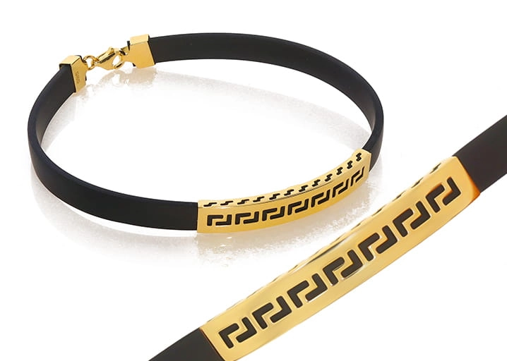 Pristatome Jums išskirtinę geltono aukso apyrankę su kaučiuku, kuri sujungia klasikinę eleganciją su moderniu dizainu. Ši apyrankė, pagaminta iš aukščiausios kokybės 585 prabos aukso, yra puikus pasirinkimas moterims, vertinančioms stilių ir patogumą. Juodas kaučiukas suteikia apyrankei šiuolaikiškumo ir kontrastuoja su spindinčiu geltonu auksu, o 6,5 mm pločio auksinė plokštelė, dekoruota graikiškais raštais, pabrėžia jos unikalumą ir išskirtinumą.