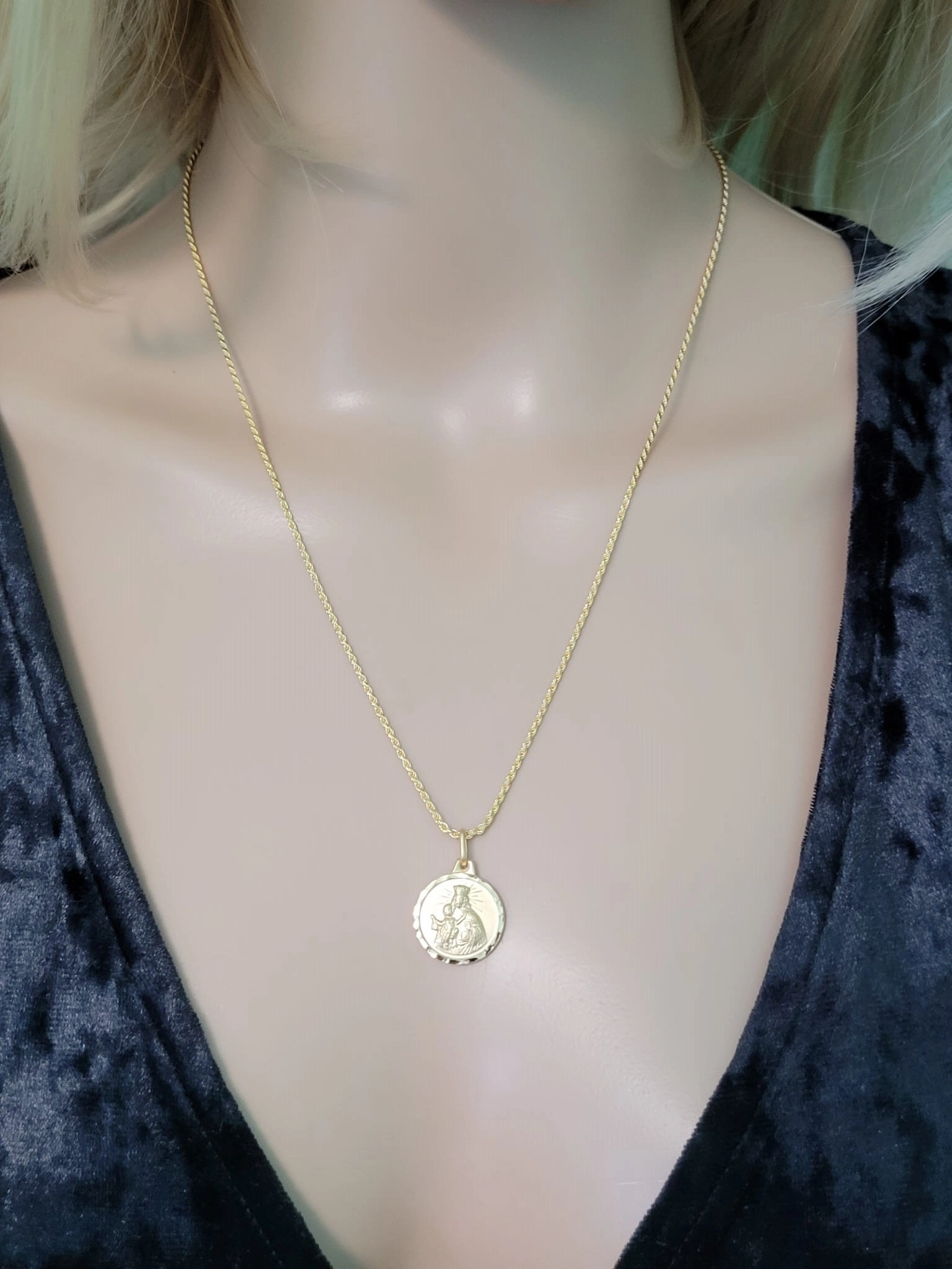 Medalikėlio dizainas sukurtas su ypatinga aistra ir precizika, užtikrinant ne tik estetinį grožį, bet ir patogumą kasdieniam nešiojimui. Vienoje pusėje pavaizduota Švč. Mergelė Marija su Kūdikiu, simbolizuojanti meilę ir apsaugą, o kitoje – Švč. Jėzaus Širdis, atspindinti gailestingumą ir atsidavimą. Šios detalės, kruopščiai išgraviruotos ant 1,6 cm pločio ir 1,6 cm ilgio medalikėlio, suteikia jam gilų religinį ir emocinį krūvį.