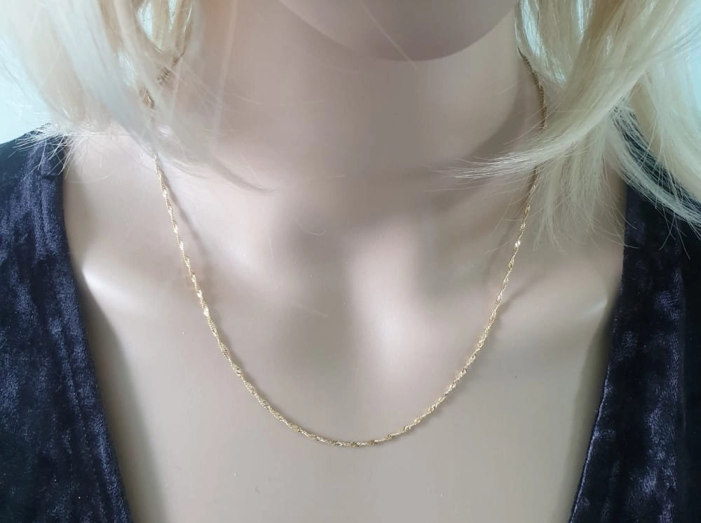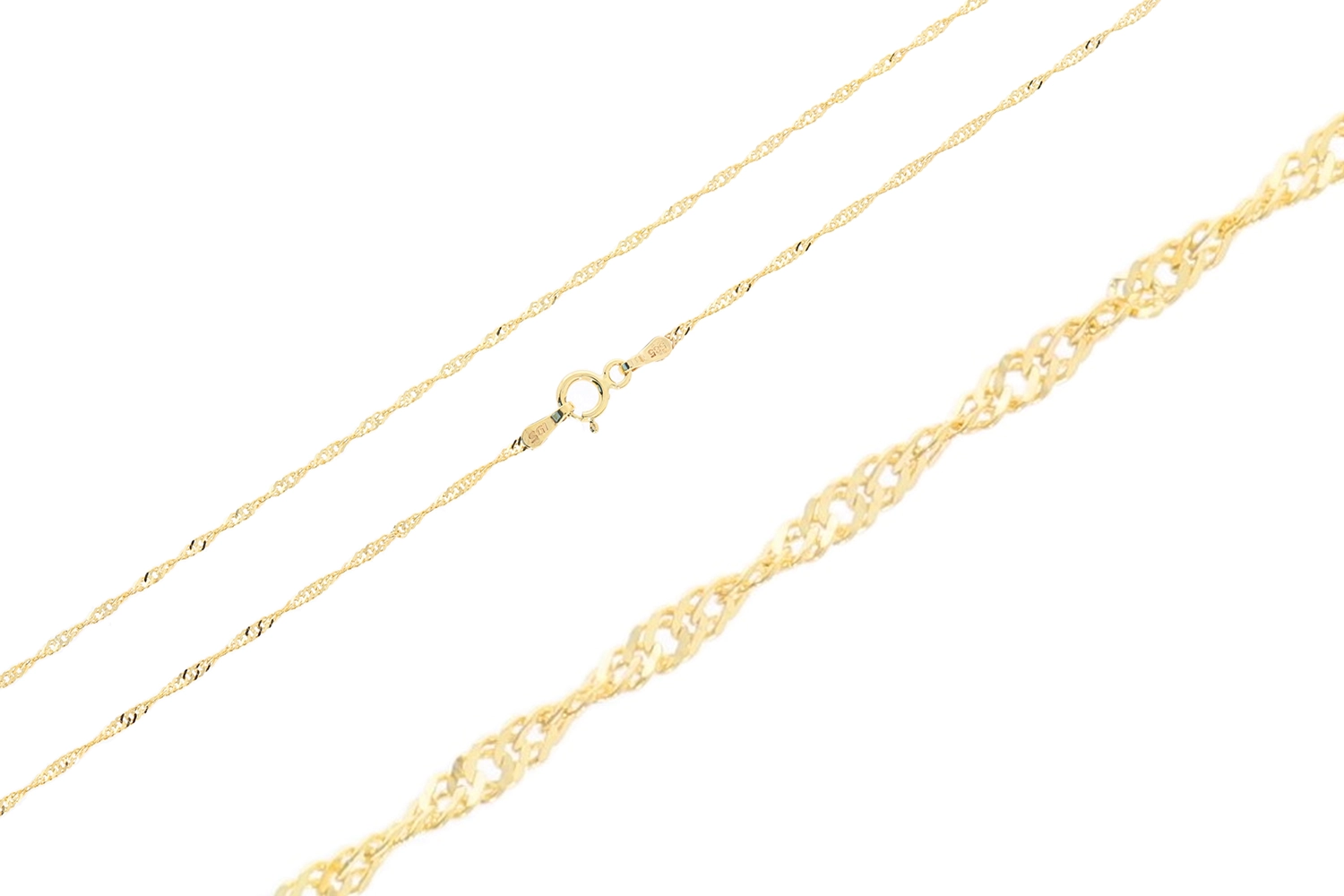 Singapore pynimas, pasižymintis savo elegancija ir švelniu spindesiu, suteikia grandinėlei ypatingo žavesio. Kiekviena grandinėlės jungtis yra kruopščiai sujungta, sukuriant unikalų, besisukantį raštą, kuris atspindi šviesą ir traukia akį. Ši grandinėlė yra pilnavidurė, todėl ji yra itin tvirta ir atspari kasdieniam dėvėjimui, idealiai tinkanti aktyviems vaikams.