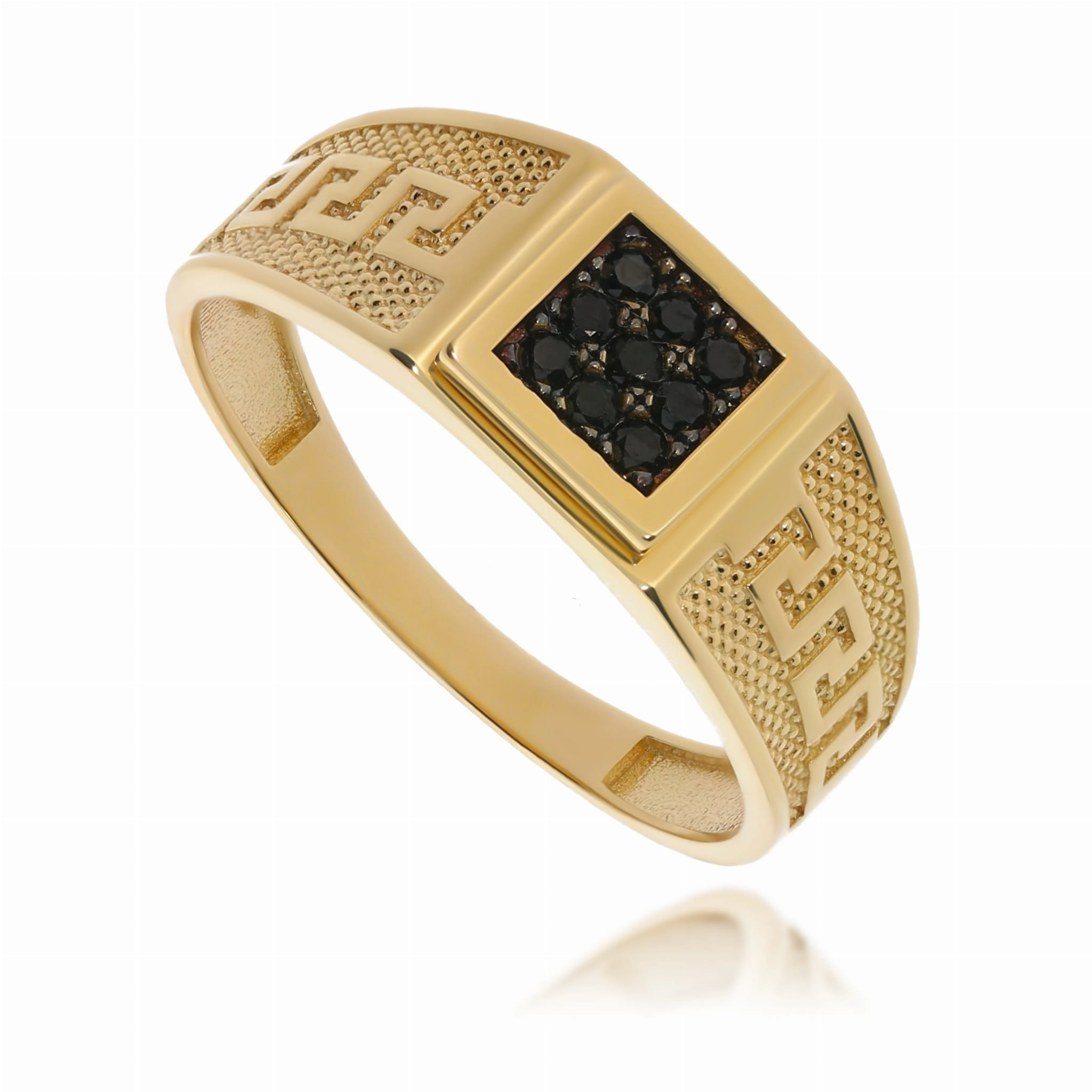 Vyriškas geltono aukso žiedas su juodais cirkoniais ir graikiškais raštais 585